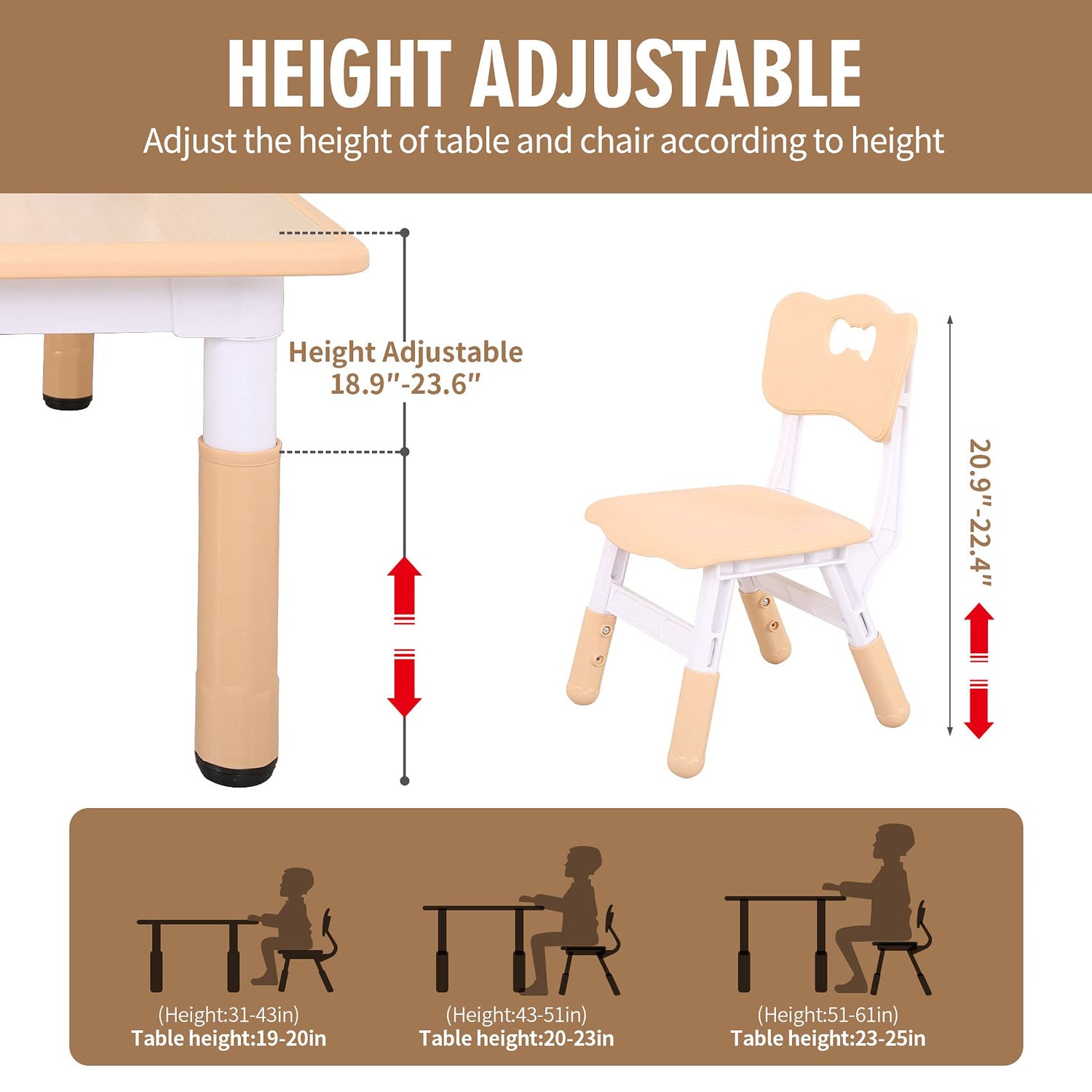 - Adjustable for Growing Kids: This versatile table and chair set is designed to grow with your child. The table height can be adjusted from 14.6” to 24.8” and the chair has 3 levels to adjust from 20.1” to 21.7”. The 1" adjustable table pad also solves uneven ground issues effectively, offering an optimal height for kids aged 2 to 10 years.