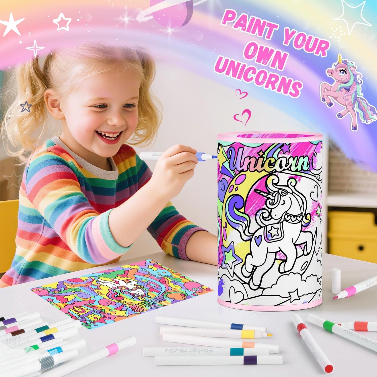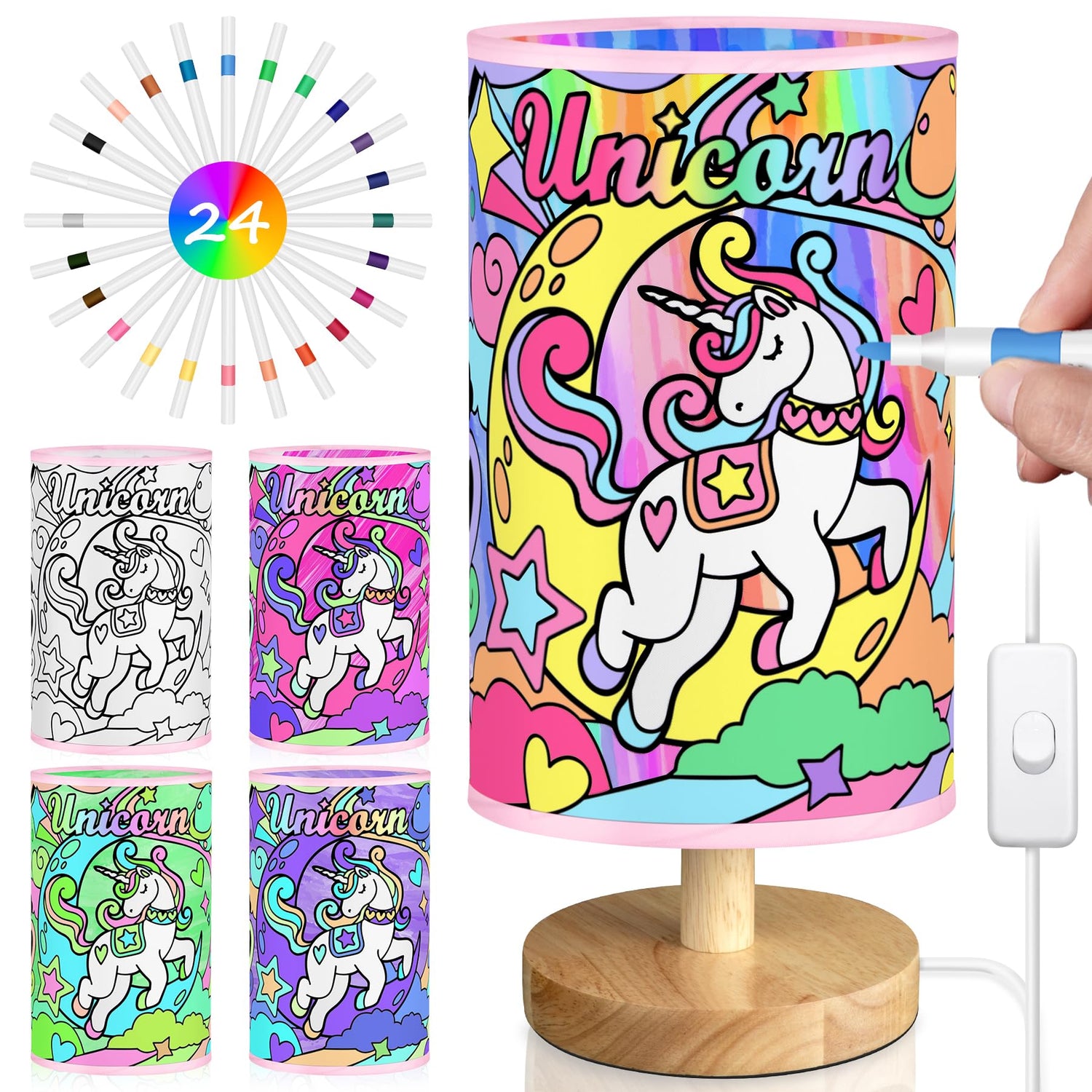 - [Paint Your Own Unicorn Lamp] This DIY unicorn lamp craft kit includes 24 upgraded acrylic markers, a color guide and a 3 colors table lamp with unicorn colorless shade. A magical craft kit that introduces kids to the exciting world of art painting in a fun and easy way. Perfect for the little artist, creator and memory gatherer