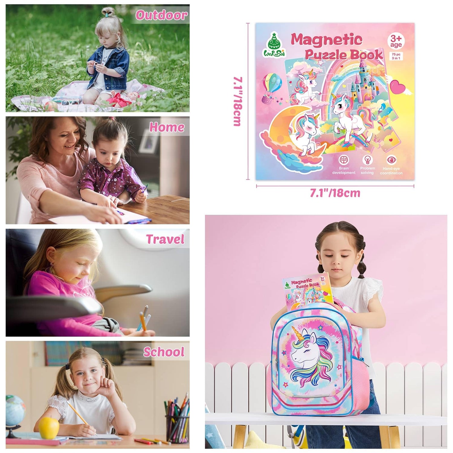 Details: - Pacakage include: 1 x Unicorn Magnetic Puzzle Book - Number of puzzles: 75 pcs (20+25+30, total 3 parts) - Suitable for which age group: 3-8 years old - Strong magnetism makes it difficult to fall off from the book and will not fall apart when stored in a backpack.