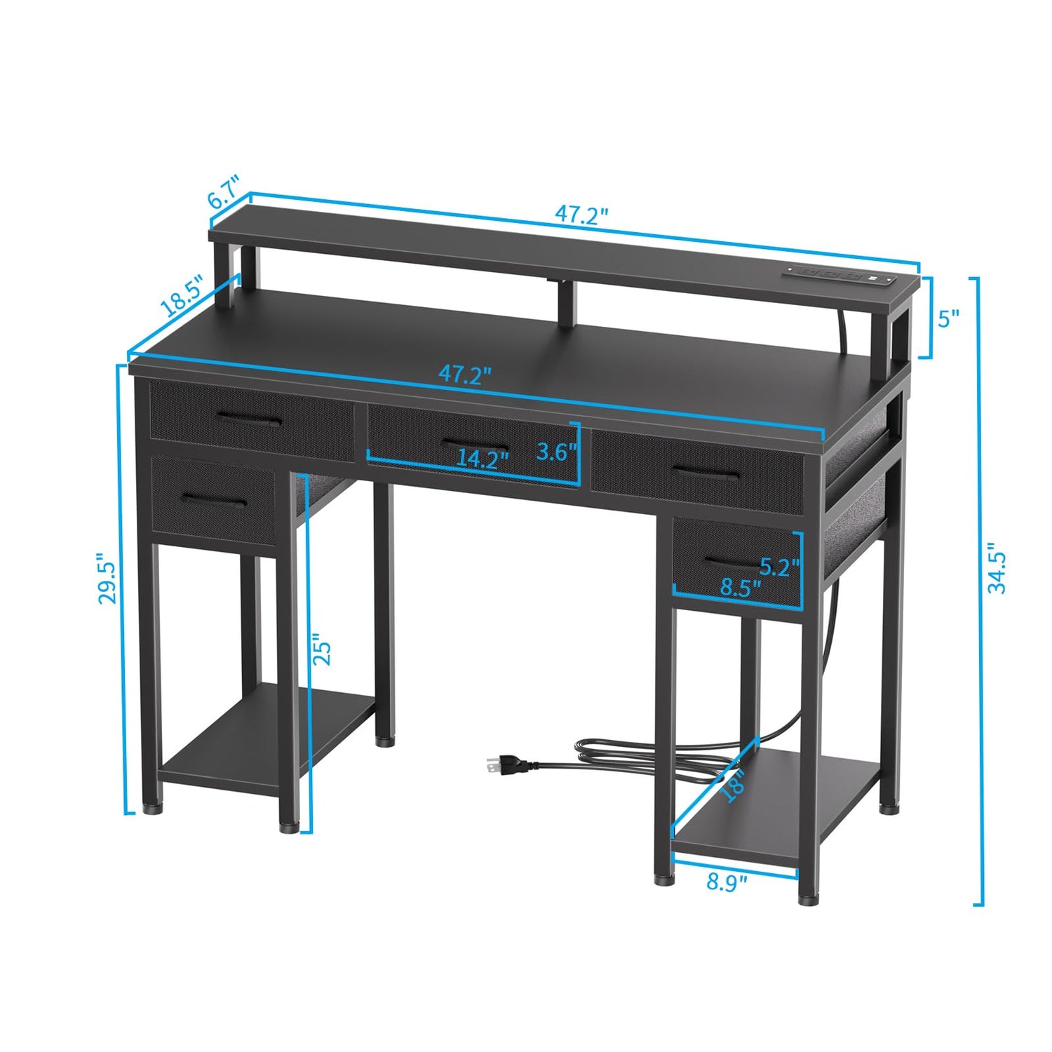 - 【Power Outlets & Monitor Stand】Upgraded with a built-in power strip, this home office desk brings a more versatile workspace. 3 AC outlets + 2 USB charging ports easily charge your computer, smartphone, PS5, and mobile power. Say goodbye to a cluttered desktop and embrace a new experience. And the monitor stands help elevate your vision and protect your cervical and spinal health.