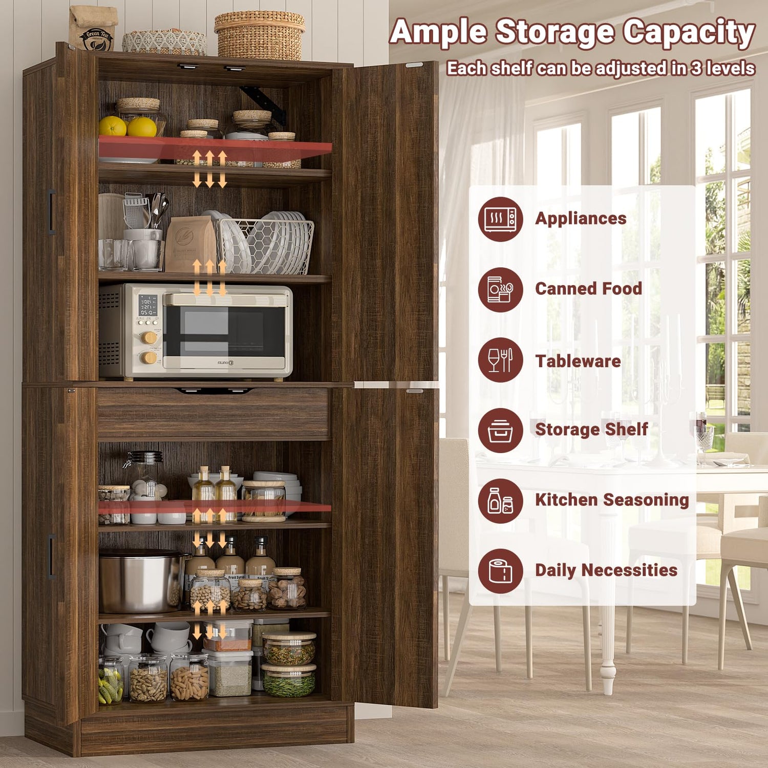 - 【Ample Storage Space】Upgrade your space with this farmhouse kitchen pantry cabinet, engineered to transform cluttered corners into curated zones. The tall kitchen storage cabinets features 8 adjustable shelves (3-tier height flexibility), 8 barn door cabinets, and a smooth-gliding middle hidden drawer, to store more pantry jars and other kitchen essentials. Elevate every corner of your home with this cabinet.