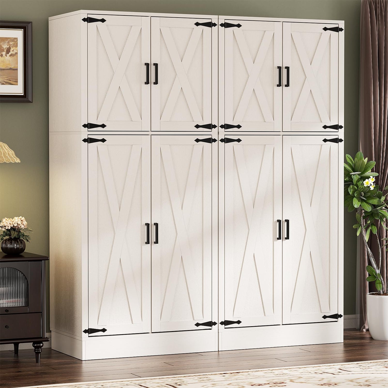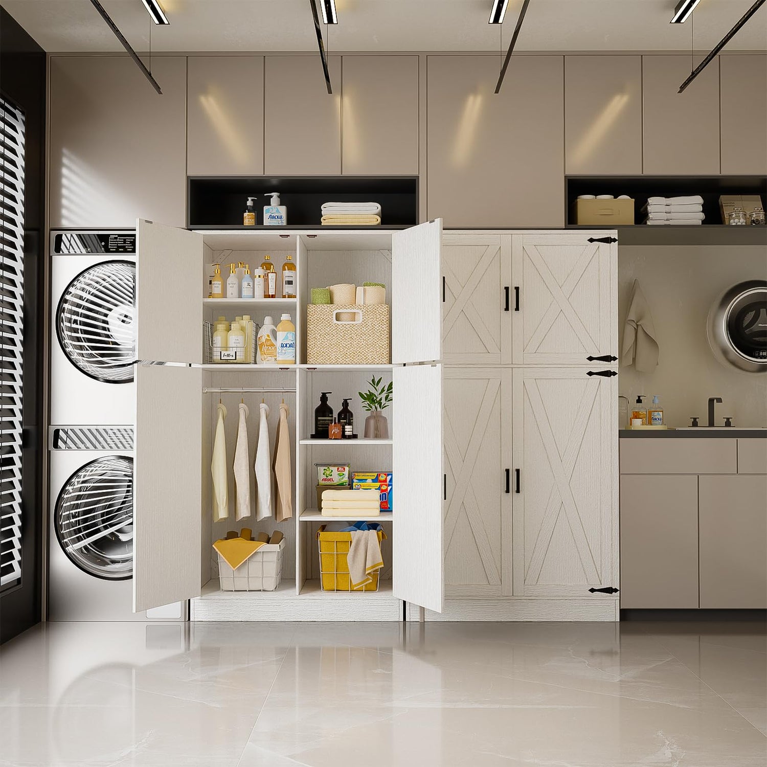 Unikito 71'' Farmhouse Wardrobe Closet with Hanging Rod, 4 Barn Door Clothing Storage Cabinet with Adjustable Shelves, Freestanding Wardrobe Cabinet for Bedroom Living Room Office, White,2 Pack