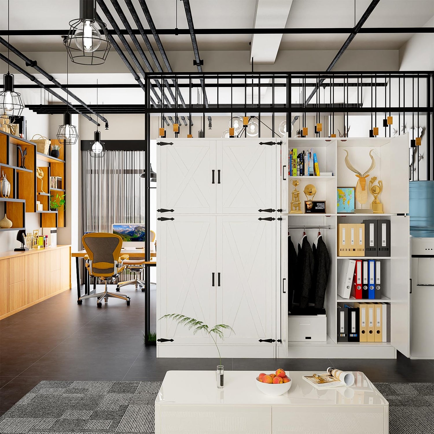 - 【Elegant Wardrobe Closet】Our tall wardrobe closet features a farmhouse style with classic barn doors, black metal handles and accents, perfectly blending a modern country aesthetic with the warmth of a vintage farmhouse, complementing a variety of decor styles in your living space.