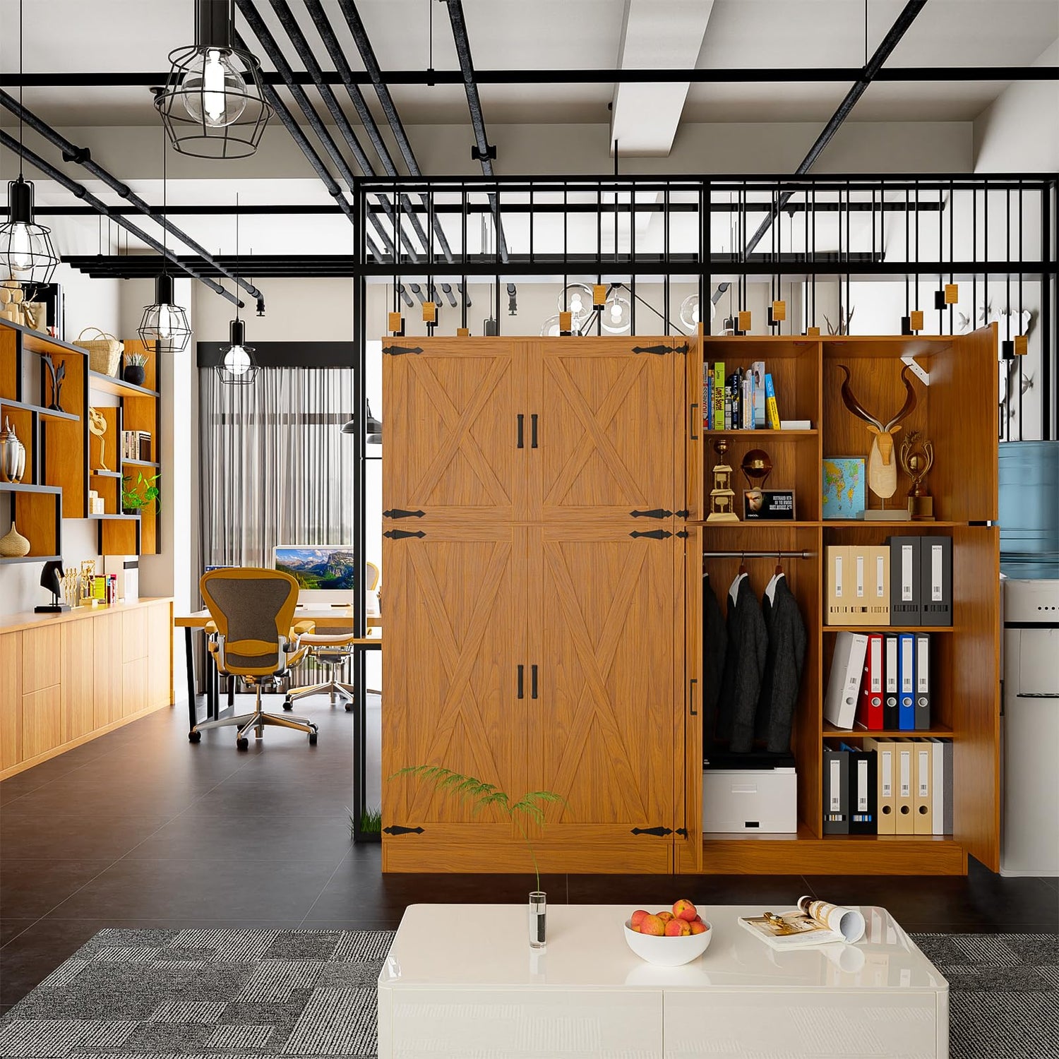 Unikito 71'' Farmhouse Wardrobe Closet with Hanging Rod, 4 Barn Door Storage Cabinet with Adjustable Shelves, Freestanding Closet Wardrobe Cabinet for Bedroom Living Room Office, Highland Oak