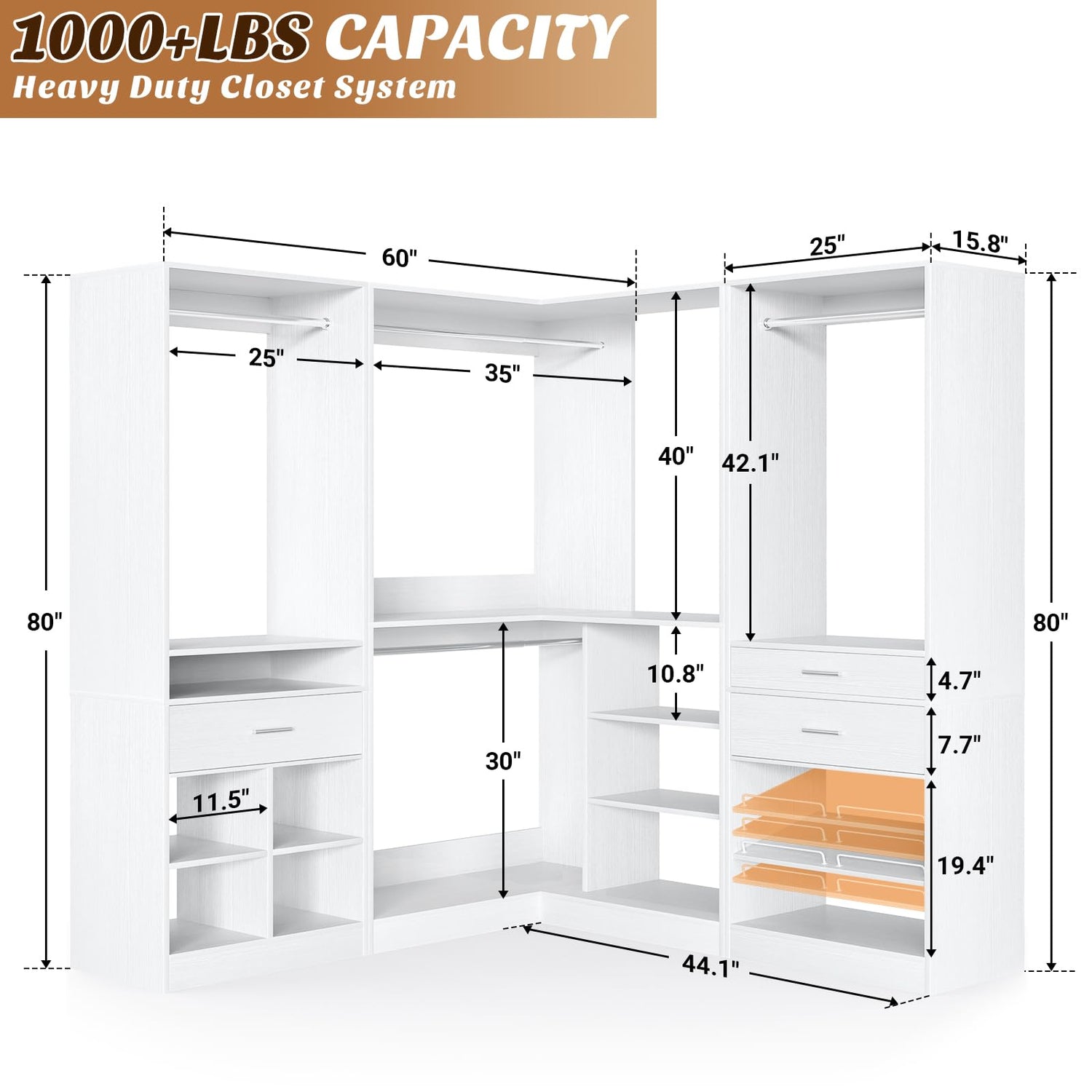 Unikito 86” Corner Closet System, Modular Closets Organizer with 4 Hanging Rods and Storage Shelves, Freestanding Adjustable Wood Clothes Garment Rack with Drawers, Sturdy Walk in Closet Tower, White