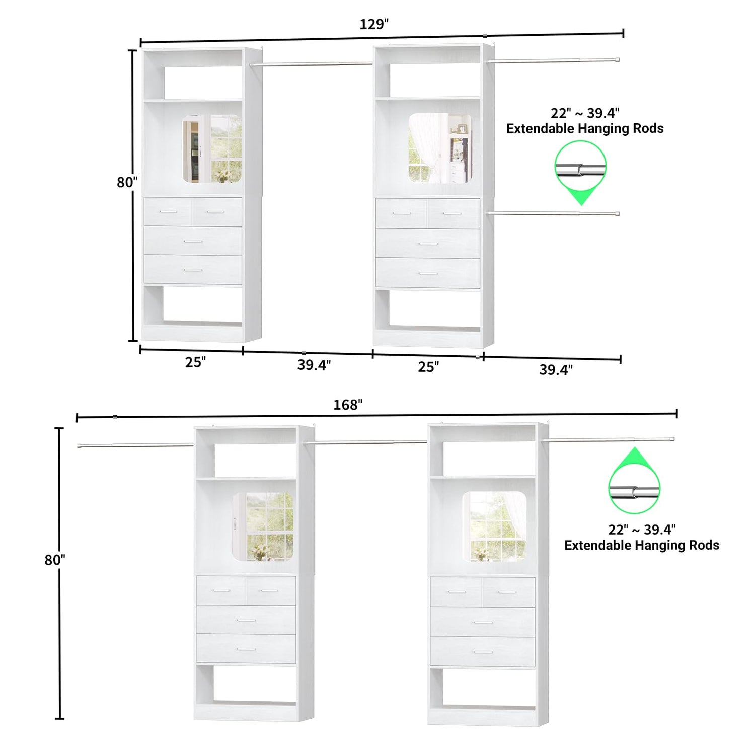 - 【Customizable and Flexible Closet System】The hanging bar is adjustable for both sides, so the closet organizer can be adjusted in many different configurations. Meanwhile, the clothes hangers are extendable from 22”- 39.4”, so you can adjust the rods size and choose which side you want them for 2 closet towers. It can fit 6ft - 14ft walk in closet system. You also can DIY your closet by cutting metal hanging bars to fit whatever customization you need.
