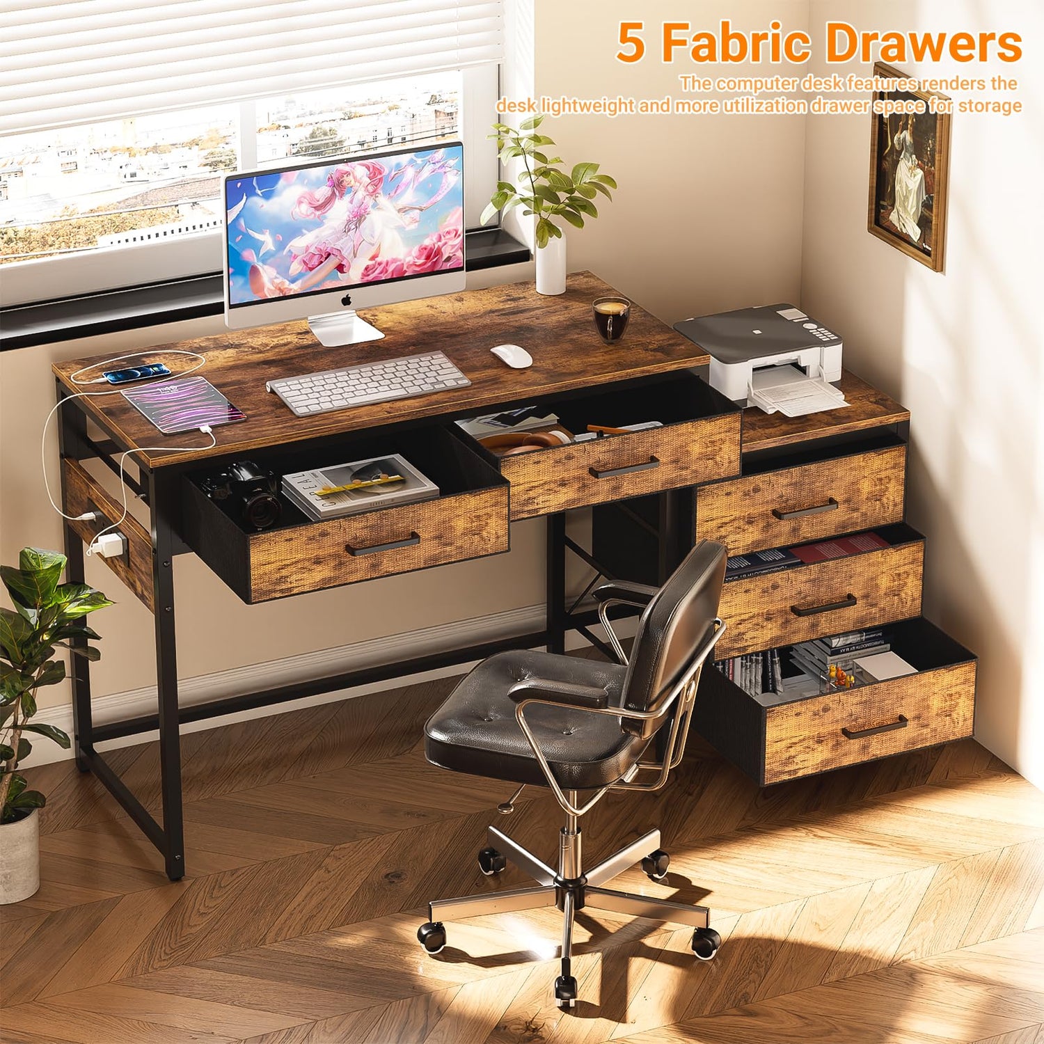- 【ROOMY STORAGE SPACE】: The 5 fabric drawers give you plenty of storage space for files, folders, pens, paperclips, books, chargers, office supplies and all your necessities. They can allow you to take items away and clear top of desk without overstuffing. The desktop has plenty of room to fit 2 monitors, laptop, keyboard, mouse and lamp perfectly and you still have some room to write if you need to.