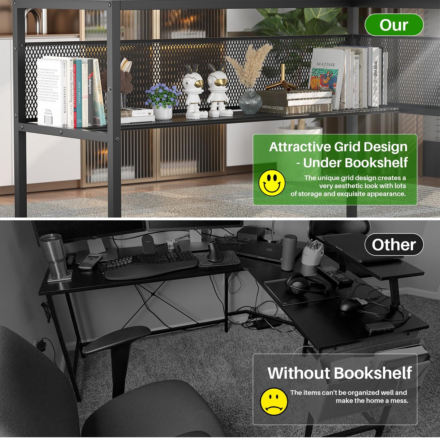 Unikito 55 Inch L Shaped Computer Desk with Power Outlets, Smart LED Lights & Unique Grid Design