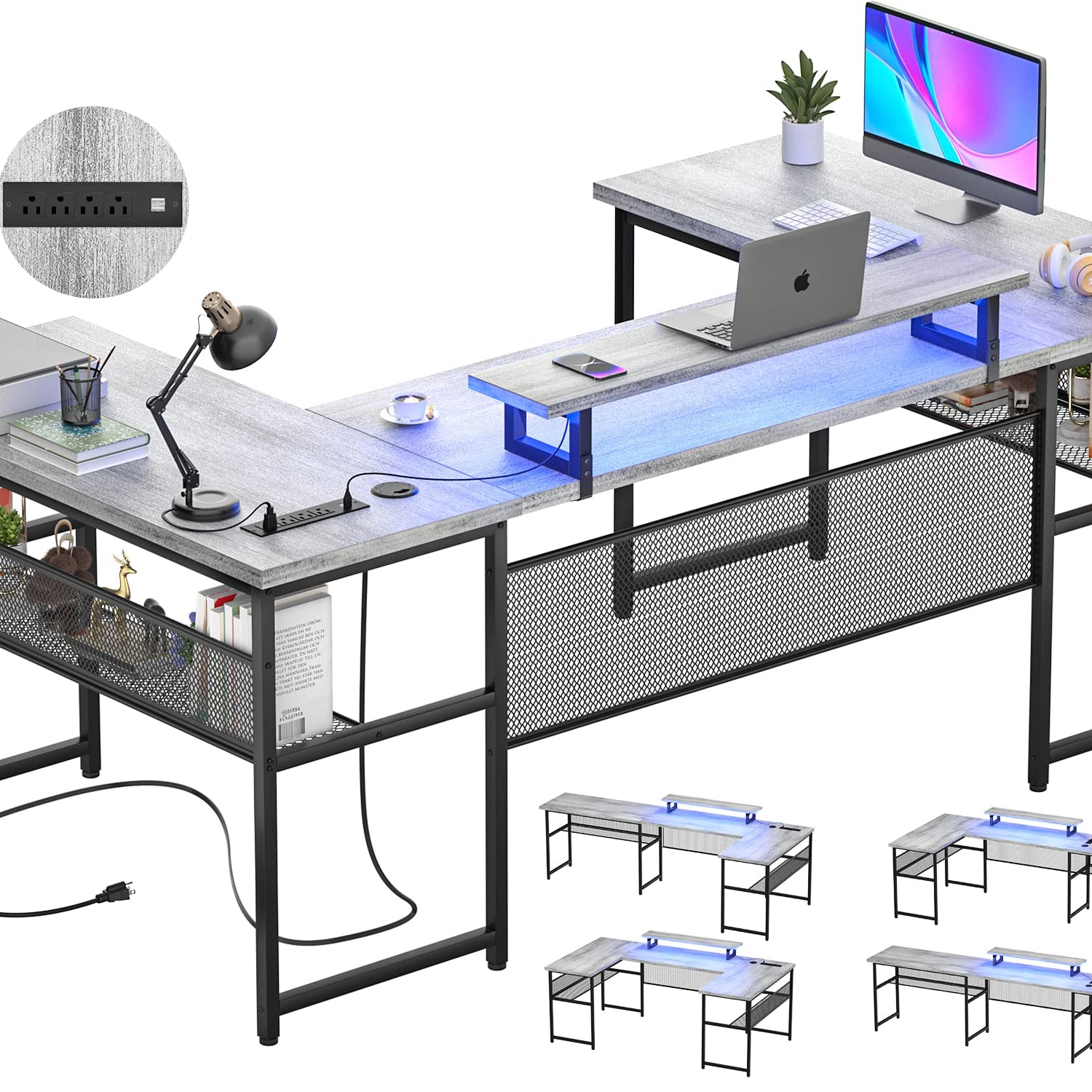 Unikito Reversible U Shaped Computer Desk with Power Outlet, LED Lights, and Monitor Stand – Modern 130 Inch Dual Purpose Office and Gaming Table in White Oak