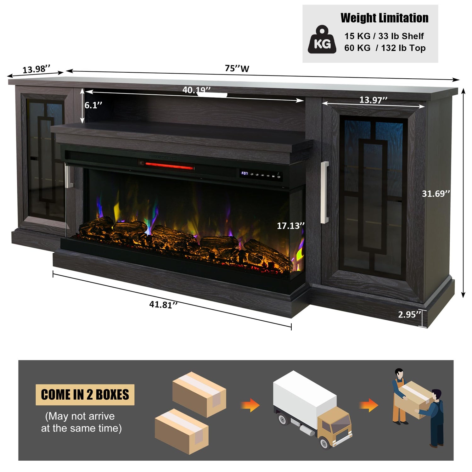 - Dimension and Installation - The tv cabinet can fit TVs up to 85 Inch, of course 80‘’70’’ 75’’or smaller TVs too, Overall dimension: 74.68''W×31.69‘’H×19.68‘’D, table top weight capacity: 120lbs; Fireplace Insert: 40’’W×18.3’’H×10’’D. Each piece of the TV console is numbered for easy identification during assembly. 2 people recommended for faster assembly. No electrician required, simple plug-in unit.