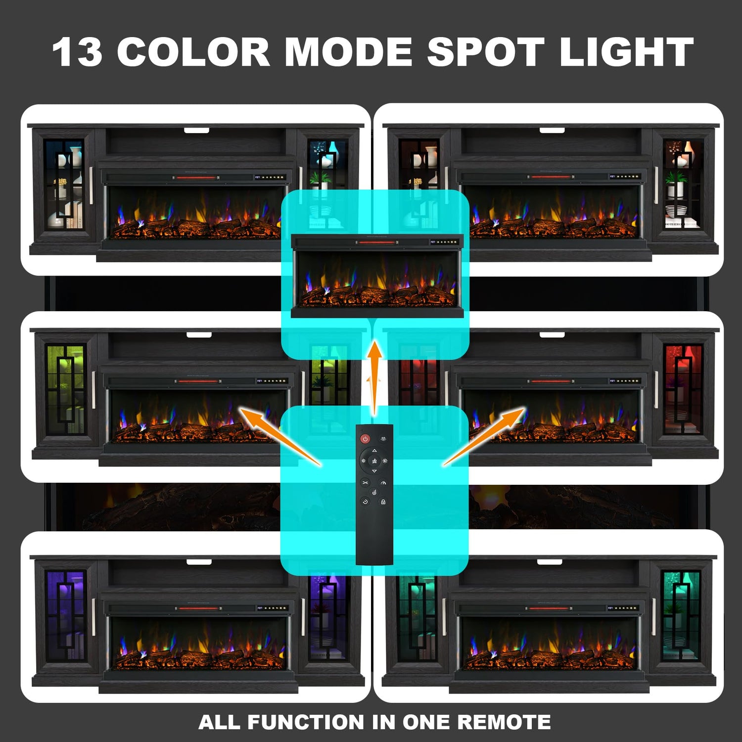 - 3-Side Electric Fireplace tv Stand – This Panoramic fireplace features a 3-side tempered glass display surrounded with the flame, make the 3D flame clearly visible from any seat in the room; And to match the LED lighting of the entertainment center, the fireplace is also available for 12 color of flame × 13 of log ember, and a life like 4.5’’ wood log set, gives you a real fire experience and flame can be adjusted for 5 level speed and brightness.