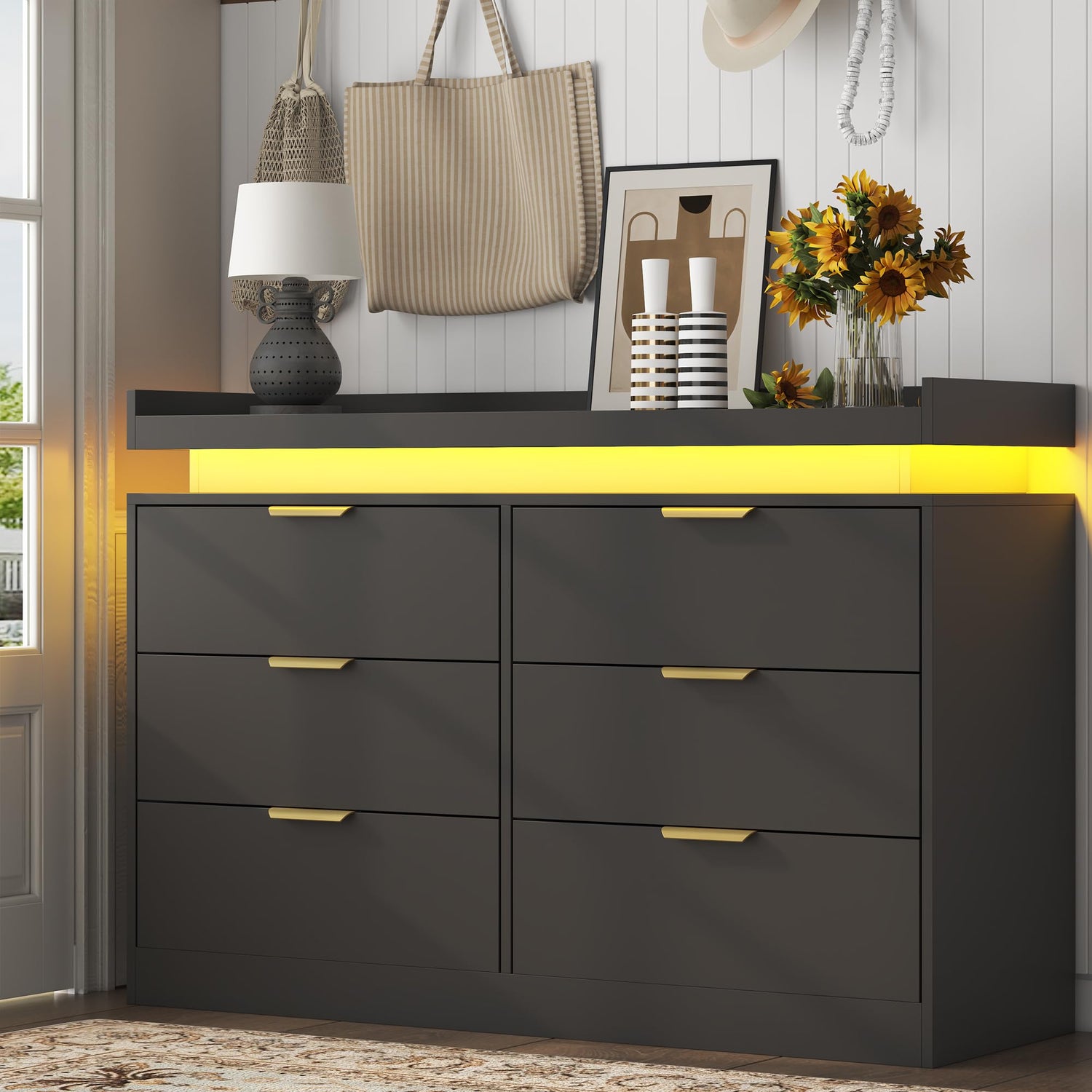 UNIQUITE 6 Drawer Dresser for Bedroom, Black Dresser with LED Lights and Power Outlet, Wooden Dressers Chests of Drawers, Double Wide Dressers for Bedroom, Living Room, Hallway