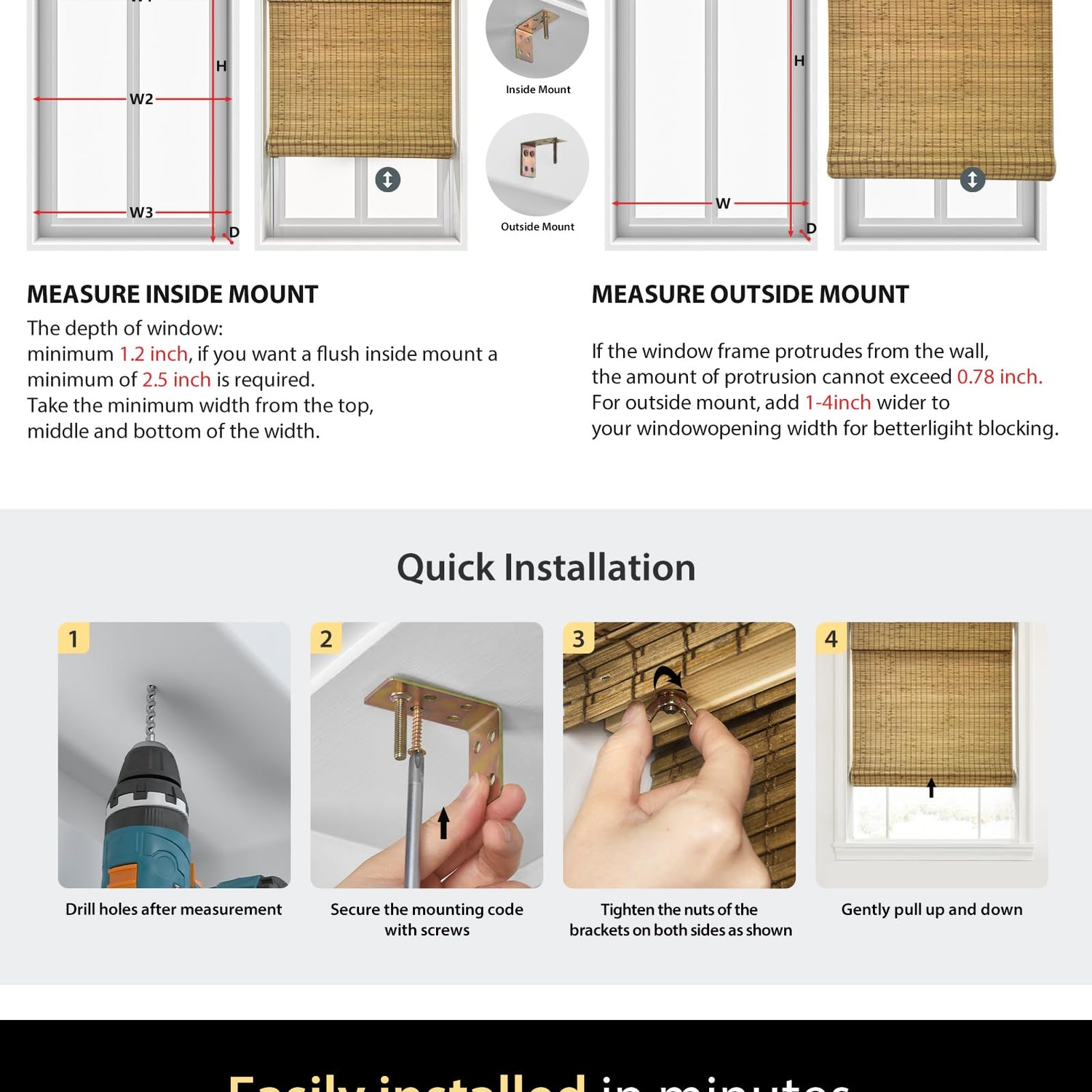 - 1【HOW TO SELECT SIZE】INSTALL INSIDE THE WINDOW (Roman Shade Width = Window Width - 2/5 inches, Roman Shade Height = Window Height) INSTALL OUTSIDE THE WINDOW: Please add 2 to 6 inches to each of the actual window width and window height to ensure coverage.