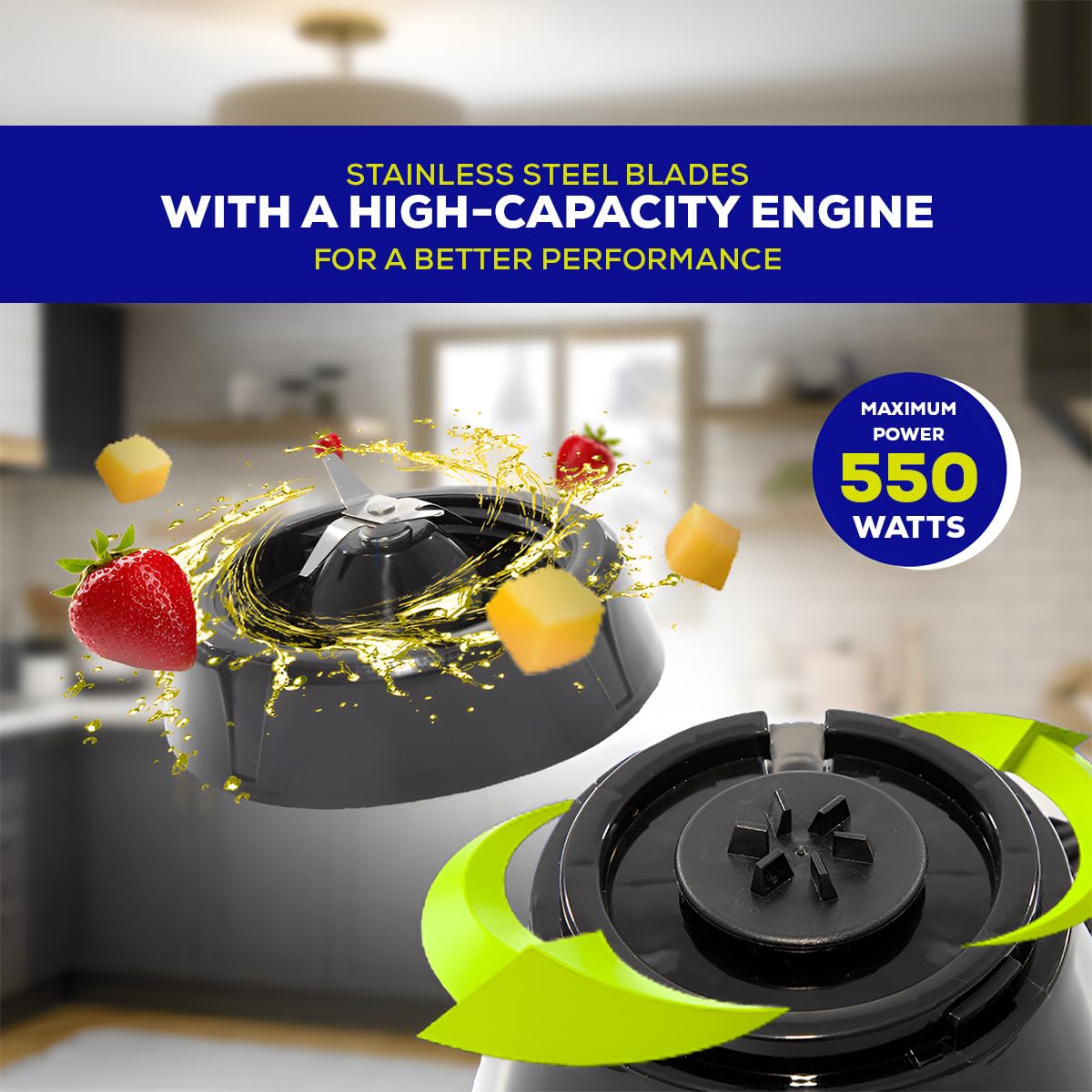 - 550 watts of Power: Our blender has an inner core that can reach 550 Watts that are quite enough to mix, blend, and crush those elaborated beverages and common blender recipes with the ideal texture for your daily requirements.