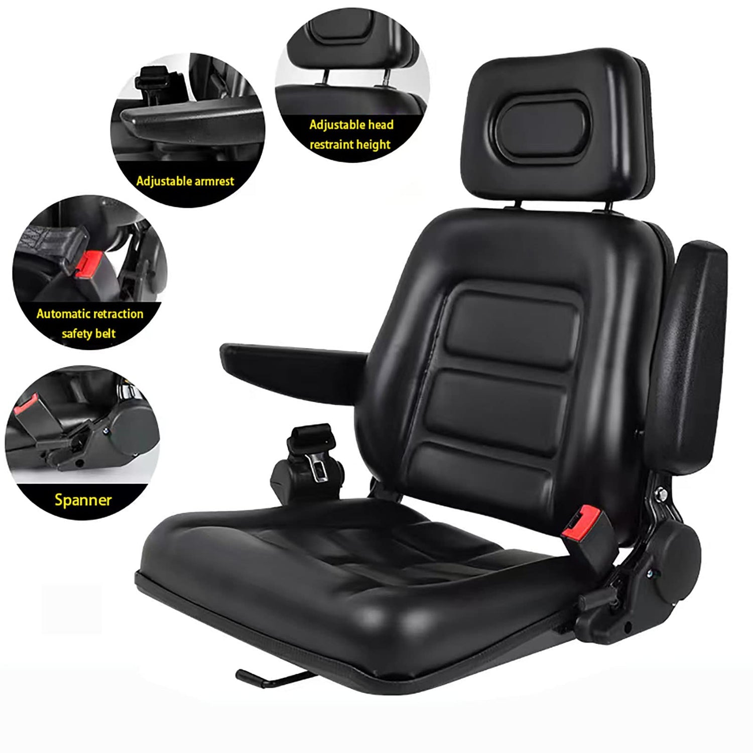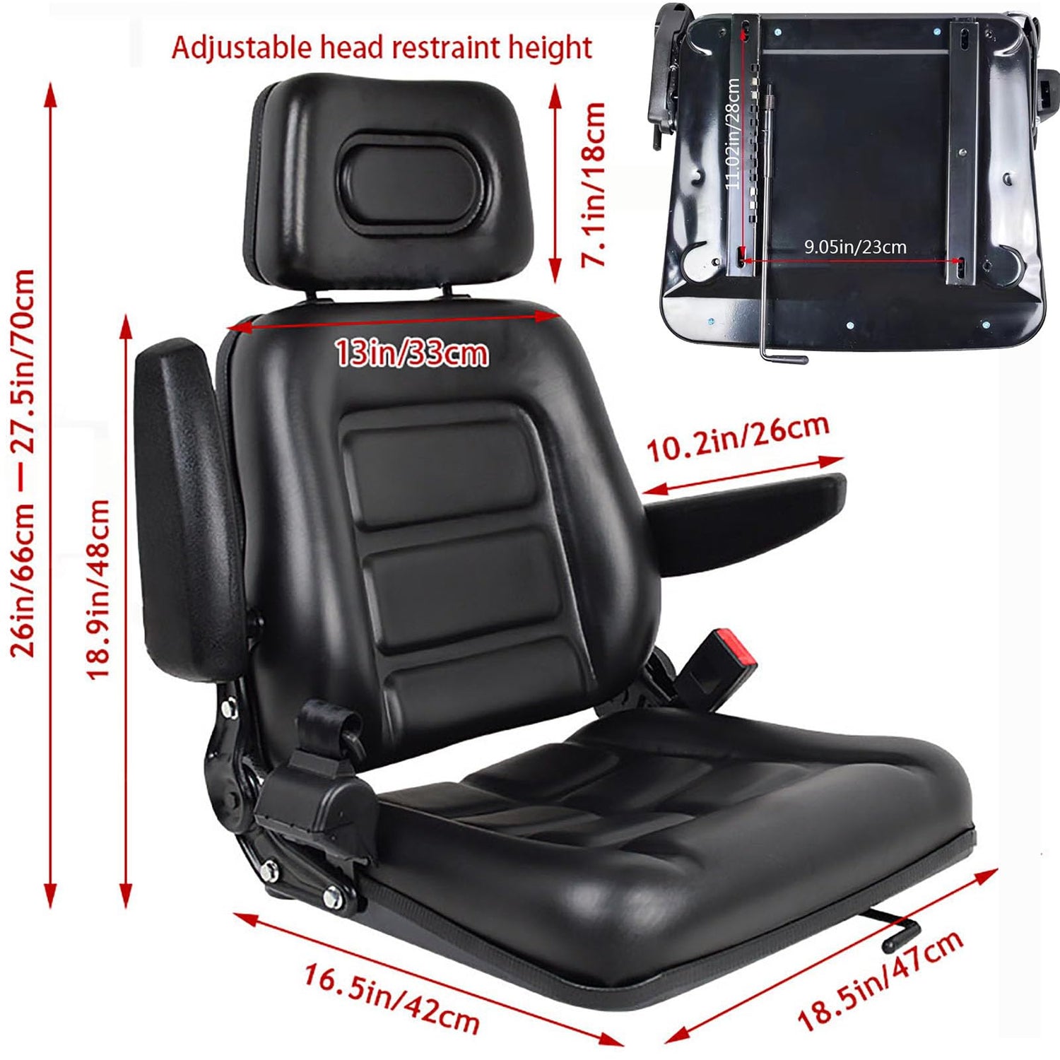 - 【Garden Tractor Seat Safety Assurance】: A universal forklift seat has been upgraded to comes with a retractable safe belt, headrest and armrest, it could keep you safe when you are working, effectively reduces the likelihood of serious injury caused by a sudden stop.