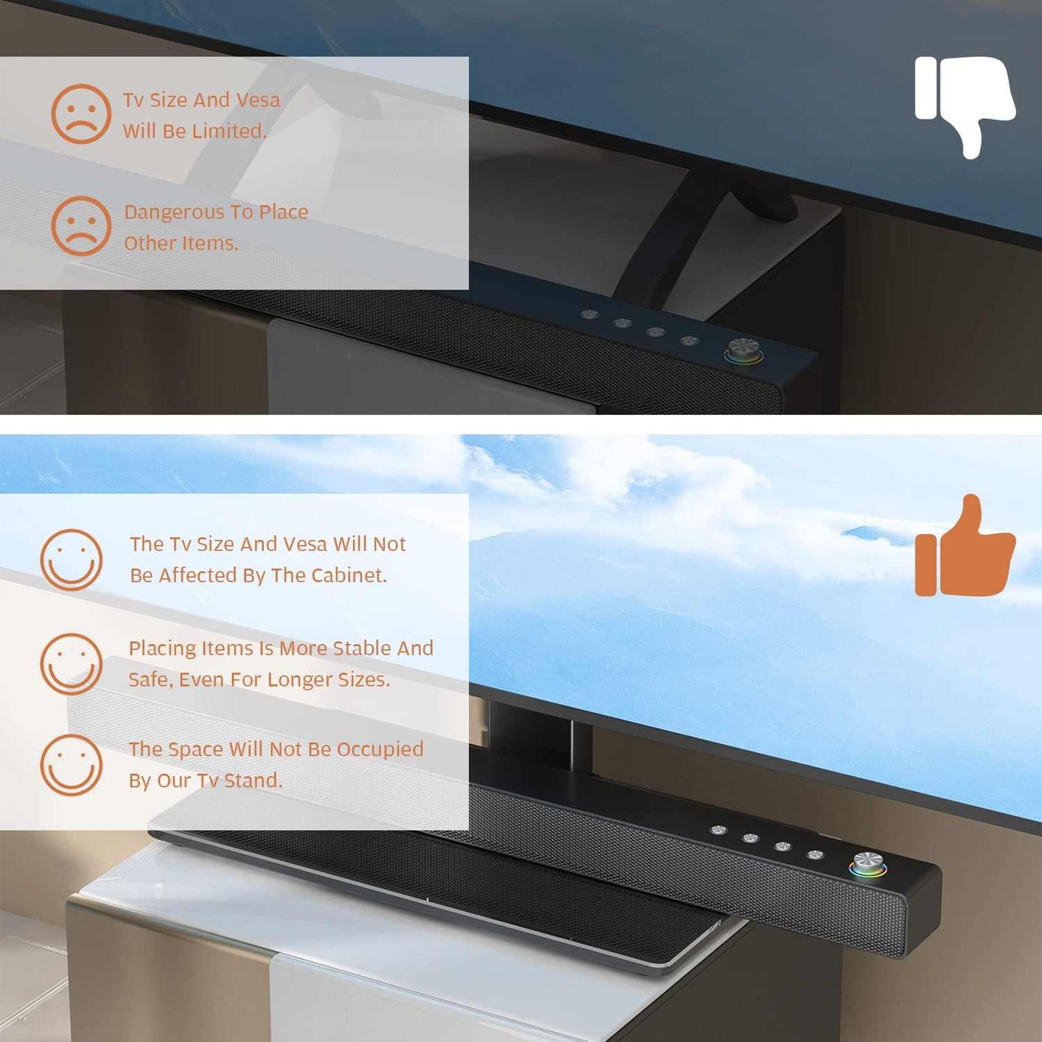 - FUNCTIONAL TV STAND WITH HEIGHT ADJUSTABLE AND CABLE MANAGEMENT ☞ My functional TV mount have 4 level height adjustment in order to choose your best space, besides integrated cable pass through port and collect the messy cables allows you to tidy your room clean