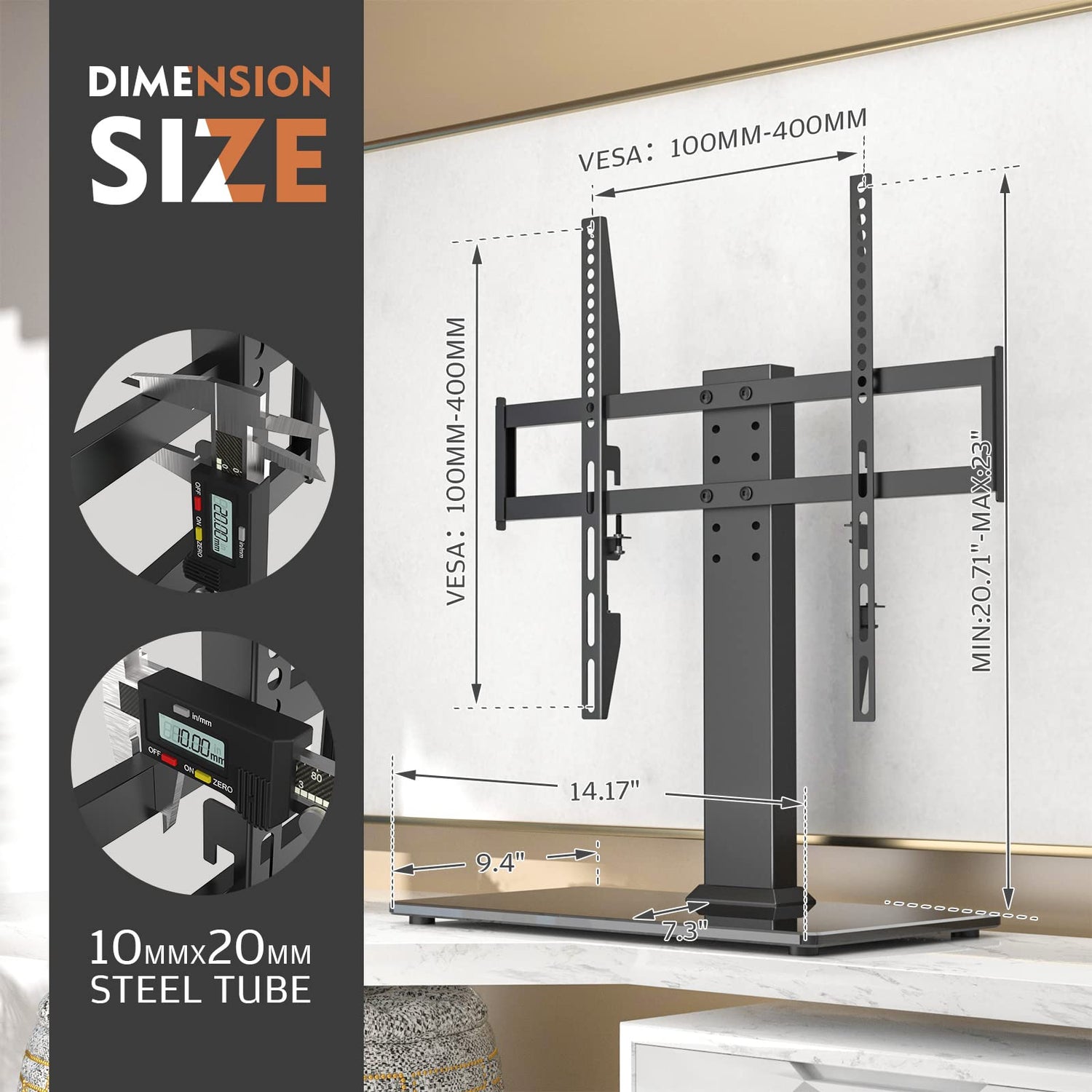 - UNIVERSAL TABLE TOP TV STAND WITHOUT DRILLING HOLE ON WALL ☞ Designed with a heavy duty steel pole and 8mm thickness tempered glass base, this universal table top TV stand can easily hold your TV on your table with safety and stability, you don't need drill holes on your wall,besides this table top TV stand fits 32 to 60 inch TVs with VESA pattern from 100mmx100mm to 400mmx400mm, holds up to 110lbs screens
