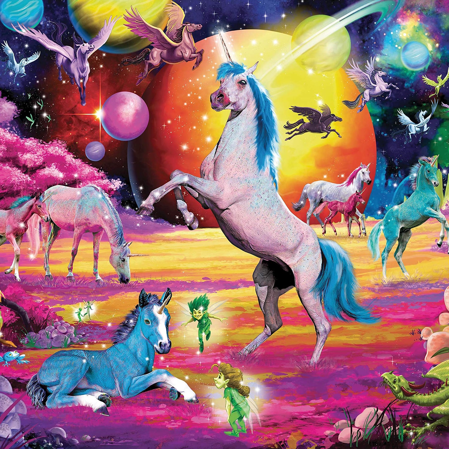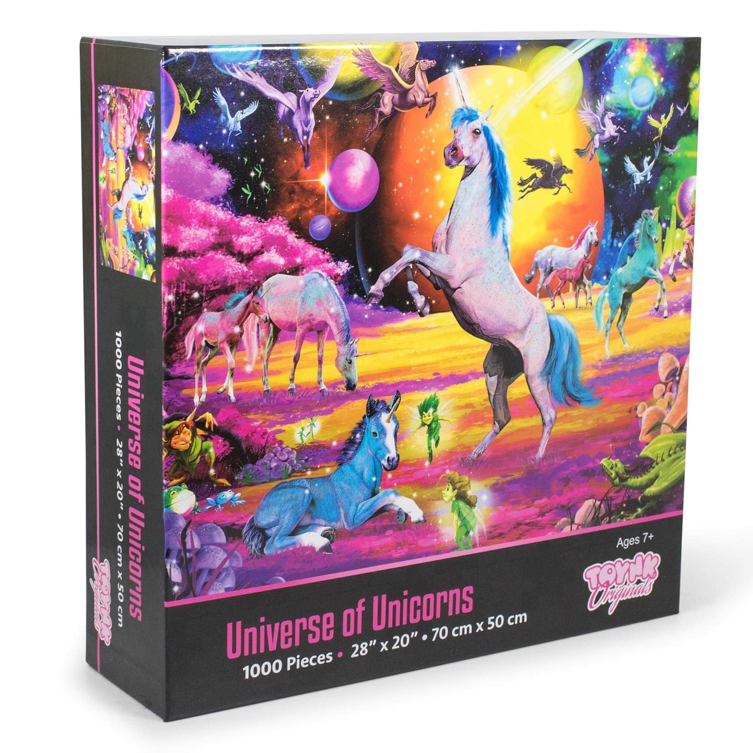 Details: THE ULTIMATE PUZZLING CHALLENGE Experience the world of myth and fantasy with this fun Magical Unicorn Jigsaw Puzzle. Measuring 28 x 20 inches, the completed jigsaw puzzle features eye-catching imagery of unicorns roaming a magical land in the cosmos. The vibrant designs feature a rainbow-like quality, with a fantastical scene that depicts a variety of mythical creatures living in harmony. The perfect way to pass the time, you can enhance your cognitive abilities with this fun and engaging puzzle toy. Improve your problem-solving skills and team-building skills through a hands-on learning experience. THE PERFECT FIT Specially made from 100% recycled puzzle board material, the premium construction provides a top-quality building experience. The precision-cut jigsaw pieces are designed to snap easily into place, ensuring a satisfying and seamless interlocking fit. You never have to worry about losing any pieces, which are safely secured inside a bag and packaged in a full-color box that shows you the finished image for reference. After you successfully assemble all of the pieces, show off your accomplishment by framing the completed 1000-piece jigsaw puzzle. This interactive puzzle toy will stimulate your mind, allowing you to decompress while enjoying hours of entertainment. Host a family game night or make it a personal challenge to complete this Magical Unicorn 1000-Piece Jigsaw Puzzle solo.