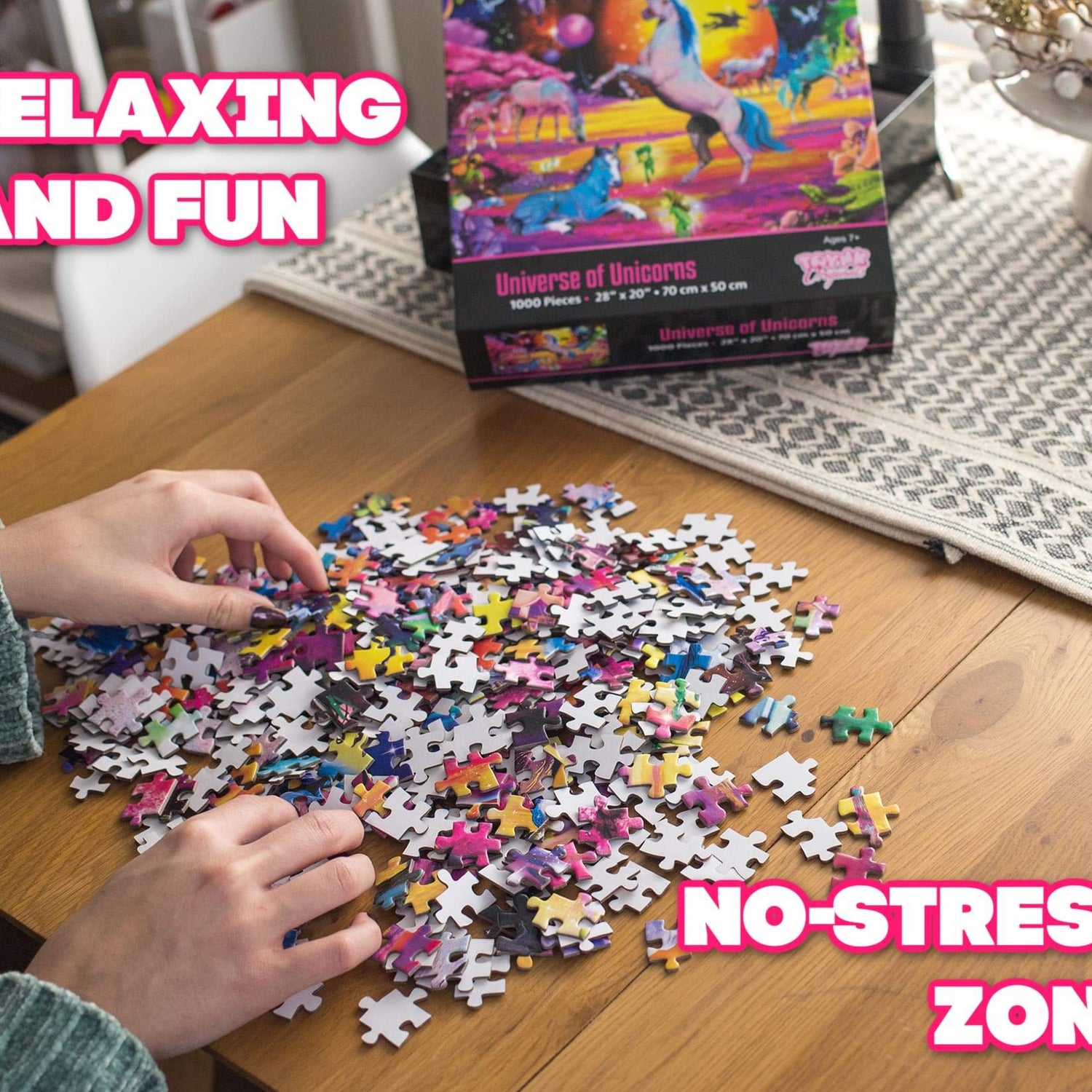 - 1000 Piece Puzzle: Enjoy hours of entertainment with this fun-filled Magical Unicorn Puzzle. To keep everything organized, the jigsaw pieces are secured inside a bag and packaged in a full-color box that shows you the finished image for reference.