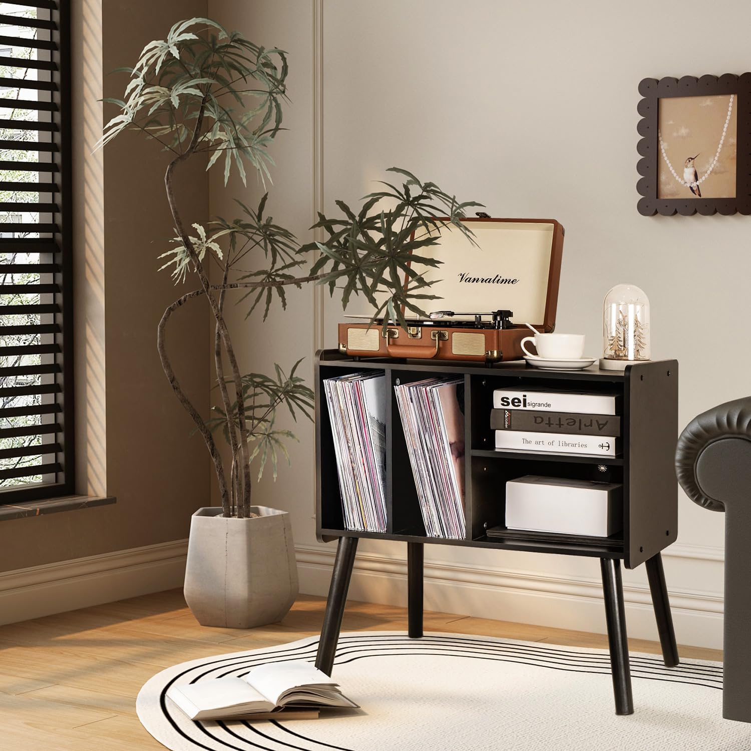 UODERS Record Player Table, Mid-Century Record Player Stand with Vinyl Storage Hold Up to 150+ Albums, Vinyl Record Cabinet with Adjustable Shelves, Wood Turntable Stand for Music Living Room (Black)