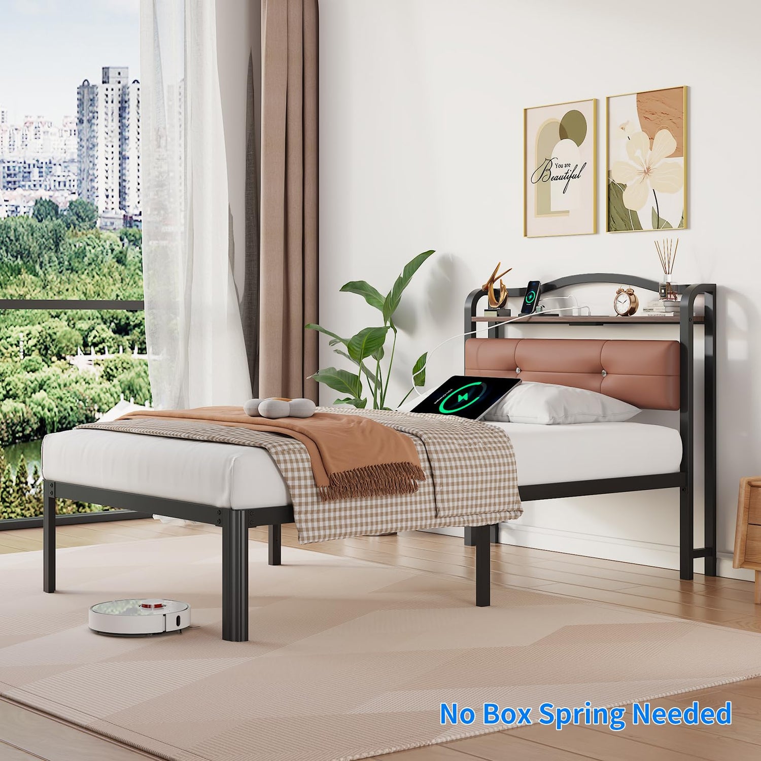 - TWIN BED FRAME WITH HEADBOARD:The twin bed frame with headboard and features1 standard AC outlet,1 USB port and 1 Type C port,as well as 6.6ft power cord.Easily charge your devices,and you can put your phone,clock,books etc on it,convenient and always within reach.