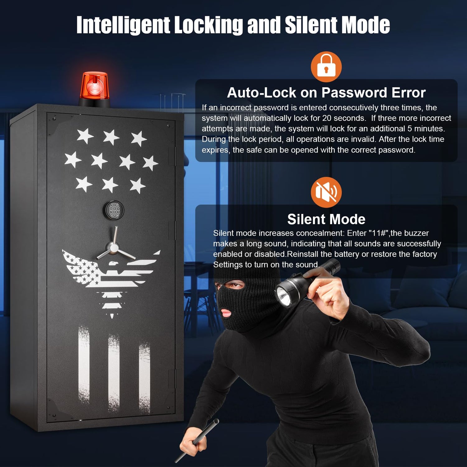 - 【Auto-Lock & Silent Mode & LED Light】: If an incorrect password is entered consecutively three times, the system will automatically lock for 20 seconds.If three more incorrect attempts are made, the system will lock for an additional 5 minutes.Silent mode increases concealment.When you enter the code to enter the gun cabinet, the LED light will come on.Also has a magnetic lamp to help illuminate the night.