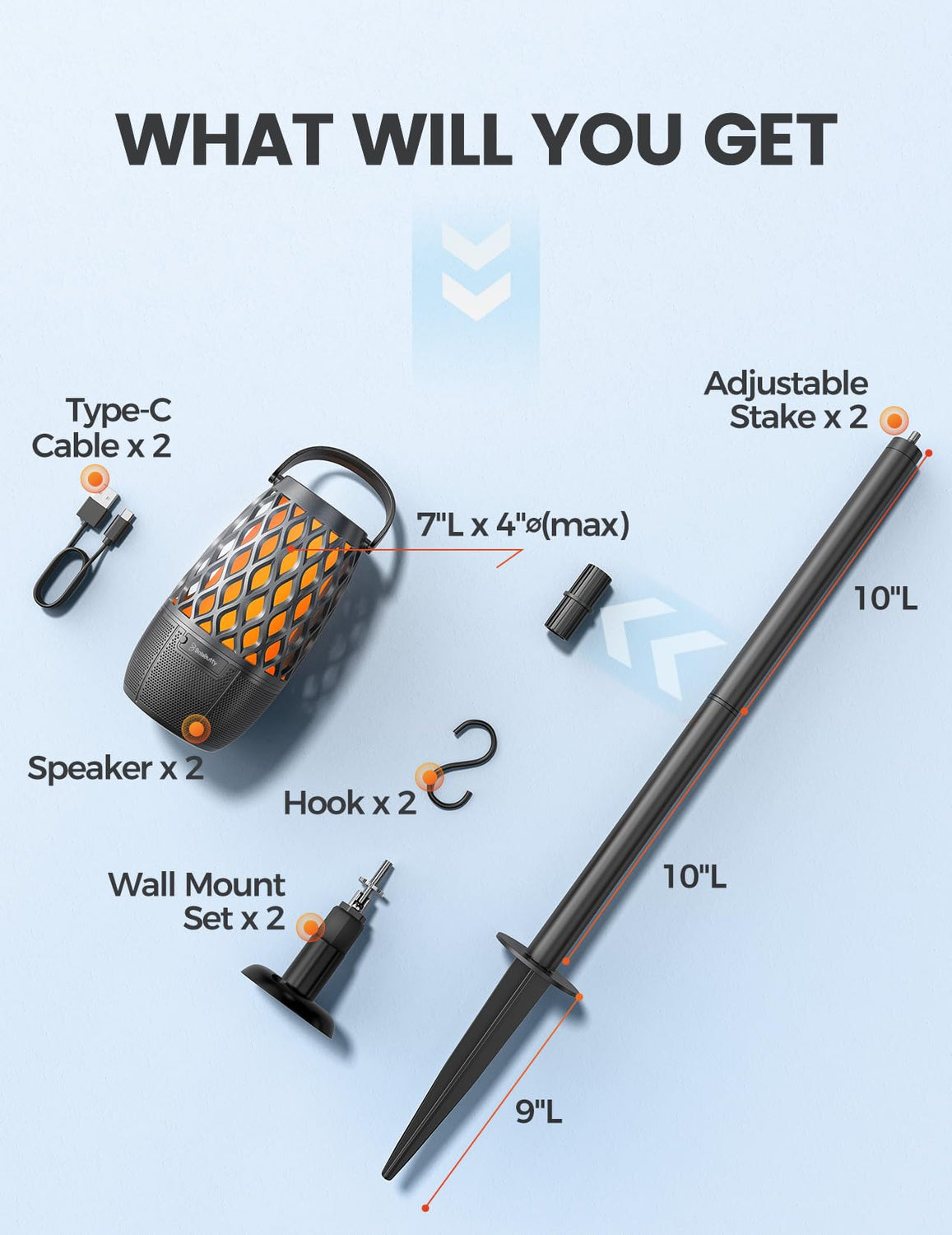- 3-Mode 360° Light Show - The LED portable speakers also work as an independent LED atmosphere lamp, patio light, or portable lantern. You can switch between flickering flame light, breathing candlelight, and solid amber light, or simply turn the light off. A pair of hooks, ground stakes, and wall mounts are included for convenient placement