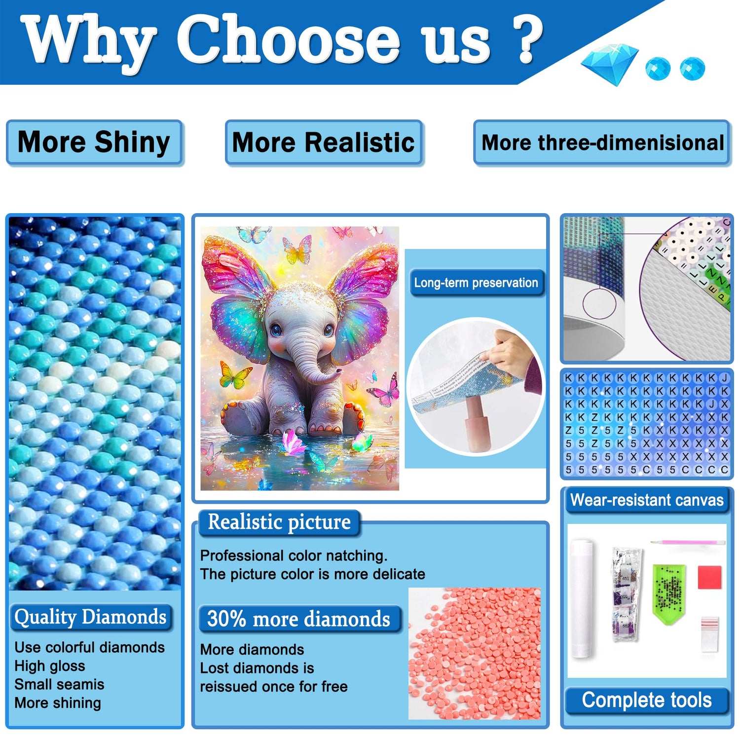 - 【Great Materials】Animal Elephant Diamond Painting Kits Use Great Pure Natural Resin Materials.The Printing Oil Canvas Is High Clear Printing,The Symbols Is Easy To Read.The Pattern Itself Has A Hot Melt Adhesive Background And Plastic Protective Film So The Diamonds Won't Fall Down Once They're Pressed Onto The Canvas.It Is Light In Texture,Moderate In Brightness,Rich In Color.
