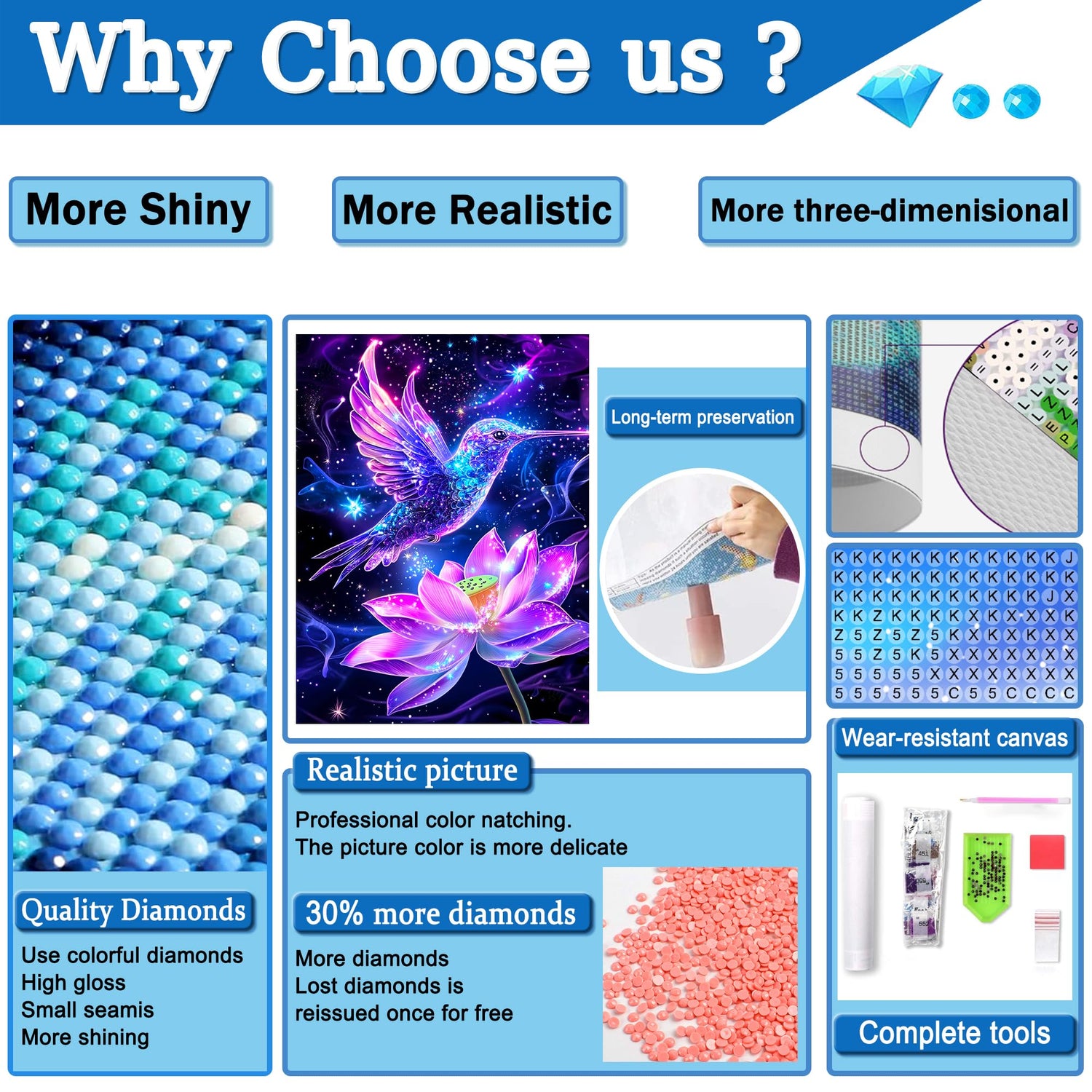 - 【5D Diamond Painting Kits】12"X16" Hummingbird Diamond Painting Has Complete Diamond Art Accessories and Tools. Following Tools Are Included: 1*Hd Painting Canvas, 1*Diamond Pen, 1*Cube Diamond Tray, 1*Red Glue Clay (0.7874 inches x 1.5748 inches), 1*Pen Grip, 10*Plastic Bags For Putting Diamonds, And Enough Colorful Round Diamonds. For Each Kit We'll Provide 20% Diamond More Than Need.
