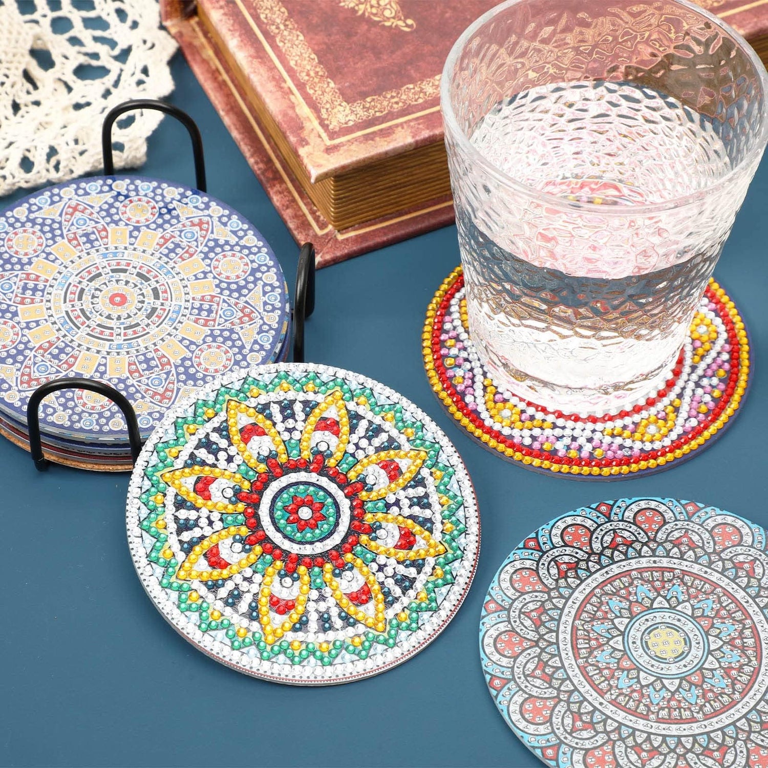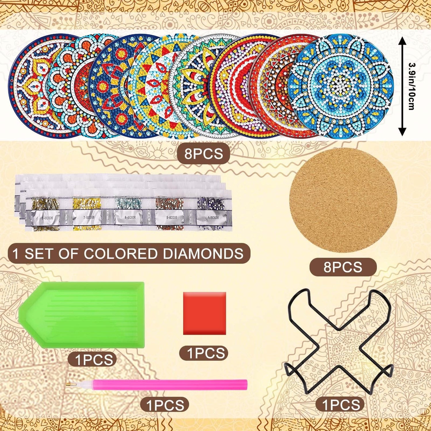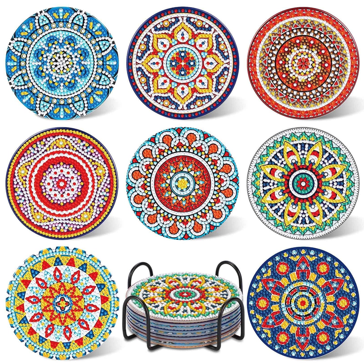 - Diamond Art Coasters Package Includes: You will receive 8pcs Mandala diamond art paintings coasters, 8pcs cork pads, 1pcs cup holder, 1 set colored diamonds, 1pcs clay glue, 1pc pen and 1pc diamond tray, which can meet your creation needs
