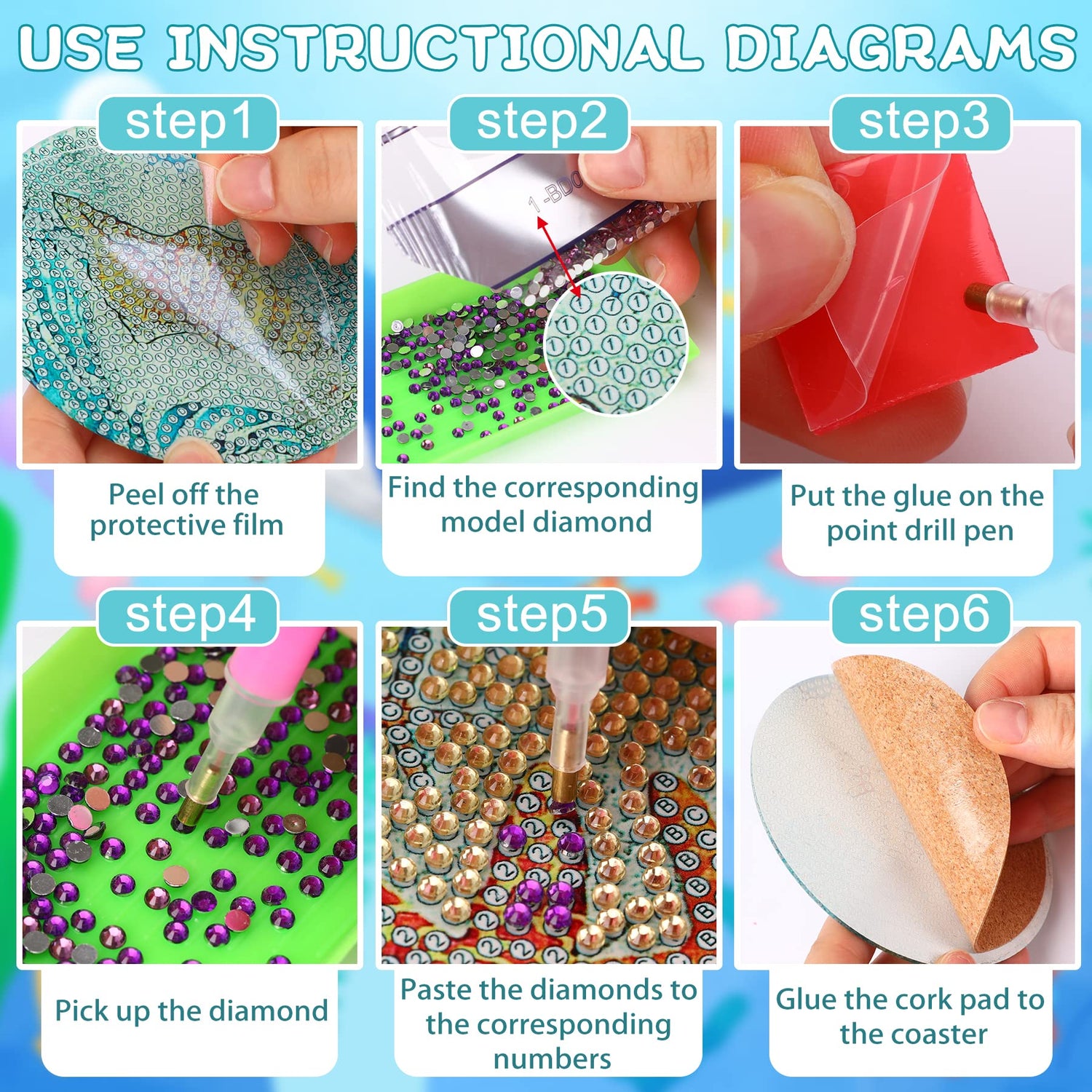 - Easy to Use: Our DIY diamond art painting Coasters kits with Holder are equipped with drawing tools that can help you with your making. The making process is as followed. Firstly, tear off the film of the coasters, then pick up the diamonds you need according to the numbers of the coaster. Lastly, stick the diamonds on the coaster