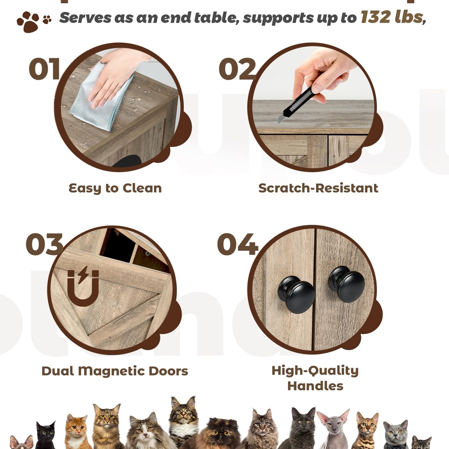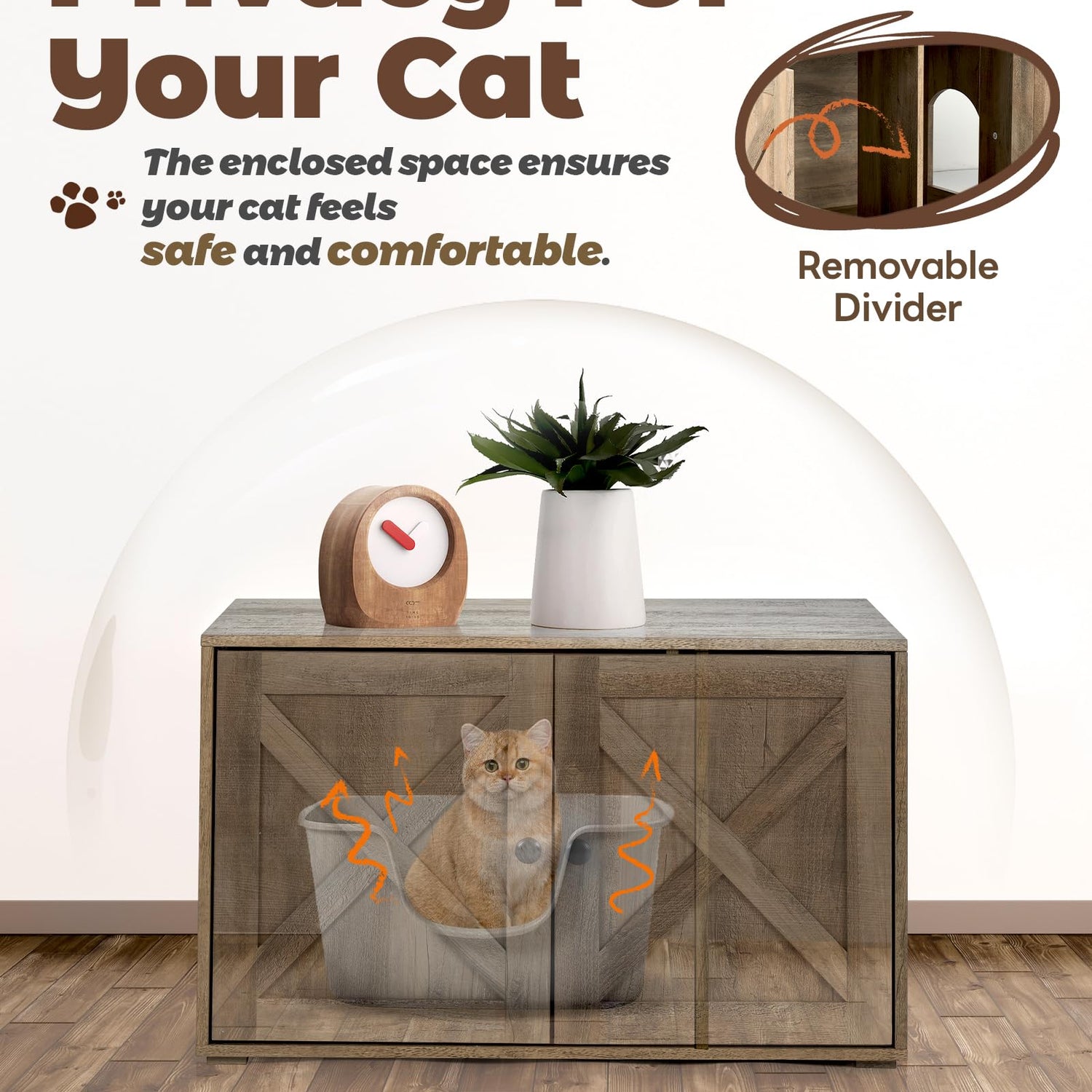 - ENHANCED ODOR CONTROL - Our hidden litter box includes built-in odor control features. The enclosed design helps contain unpleasant smells, ensuring your living space remains fresh. Regular cleaning is made easy with the wide-opening doors, providing quick access for scooping and maintenance.