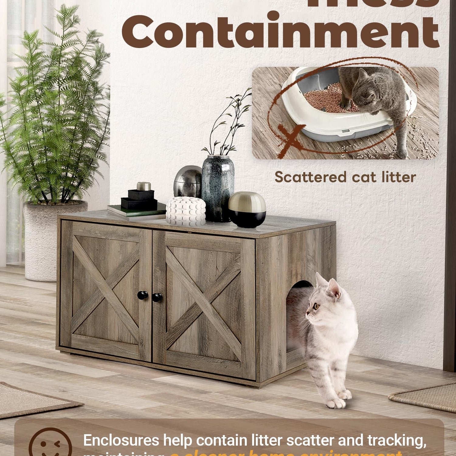 - STYLISH AND FUNCTIONAL DESIGN - The Upolana cat litter box enclosure features a rustic finish and unique barn doors, effortlessly blending into any home decor while discreetly hiding your cat's litter box. Transform an eyesore into an attractive piece of furniture.