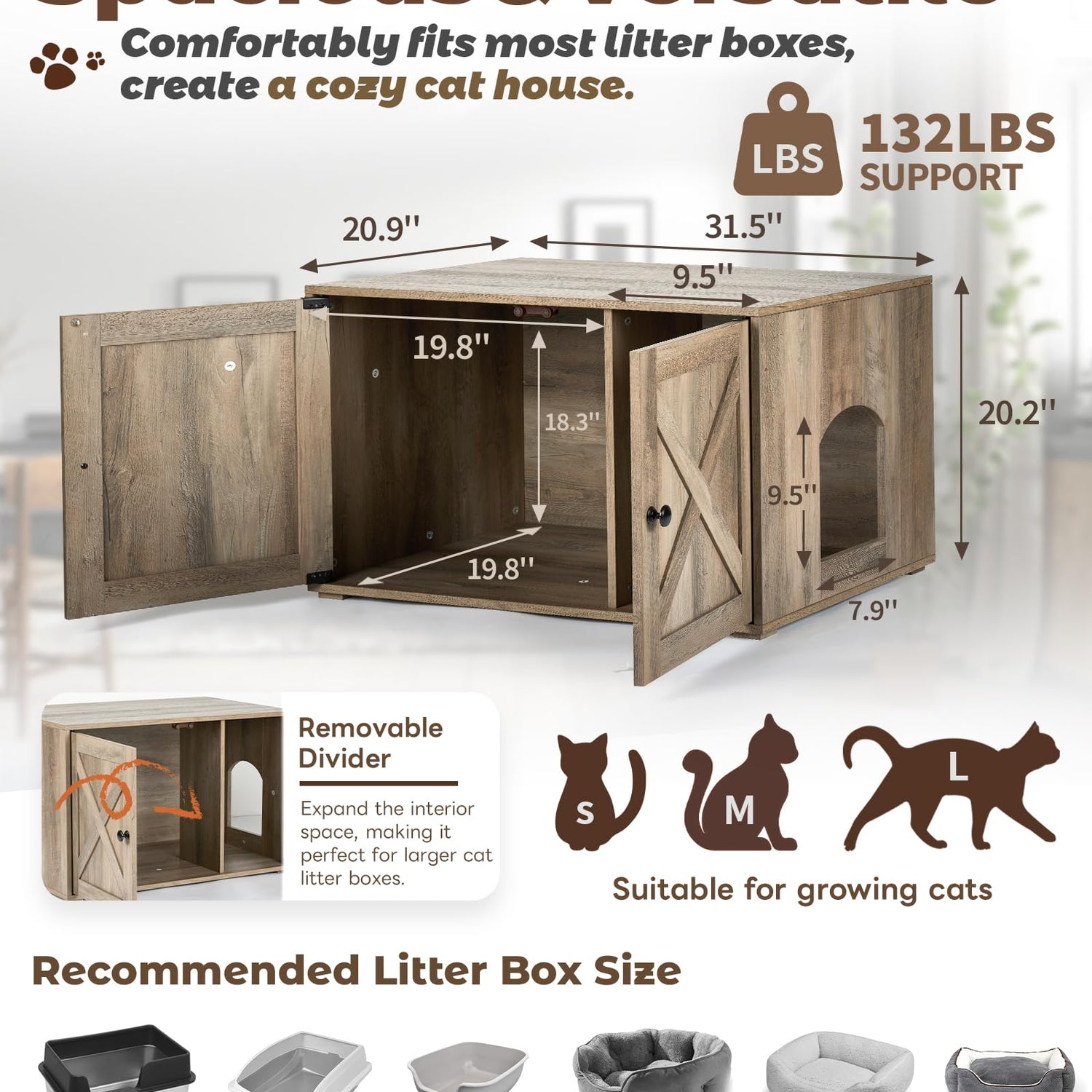 - SPACIOUS AND VERSATILE - With dimensions of 32" x 21" x 20", this litter box cabinet comfortably fits most litter boxes. The additional storage space allows you to keep cat litter and accessories neatly organized in one place. The adjustable divider can be removed to accommodate larger litter boxes or create a cozy cat house.