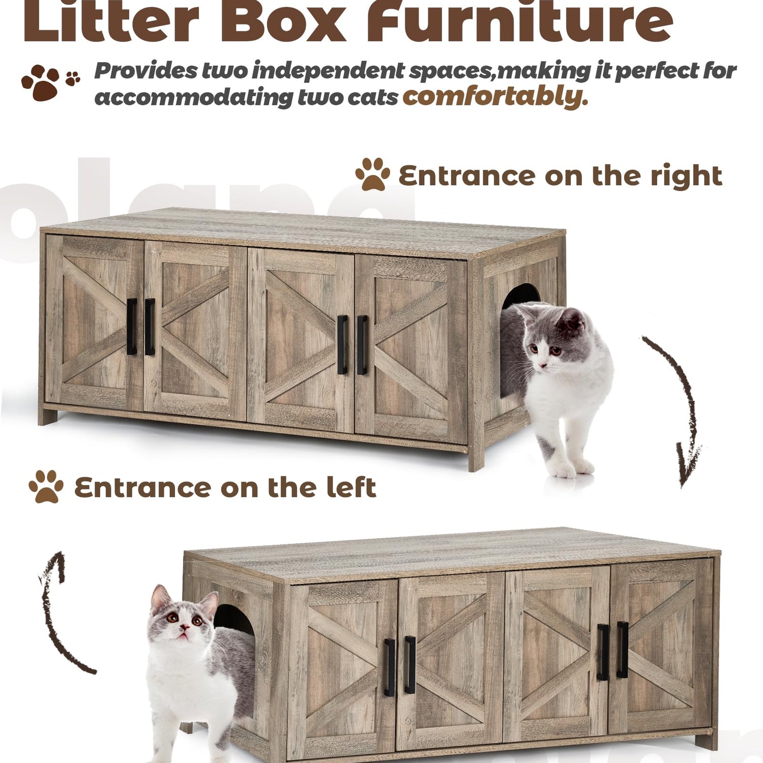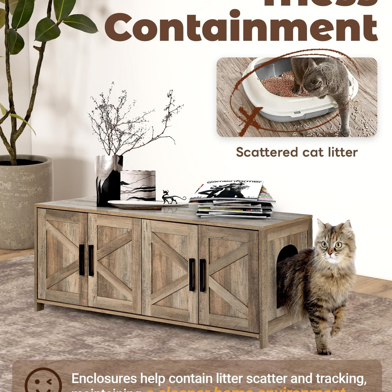 - STYLISH AND FUNCTIONAL DESIGN - The Upolana cat litter box enclosure features a rustic finish and unique barn doors, effortlessly blending into any home decor while discreetly hiding your cat's litter box. Transform an eyesore into an attractive piece of furniture.