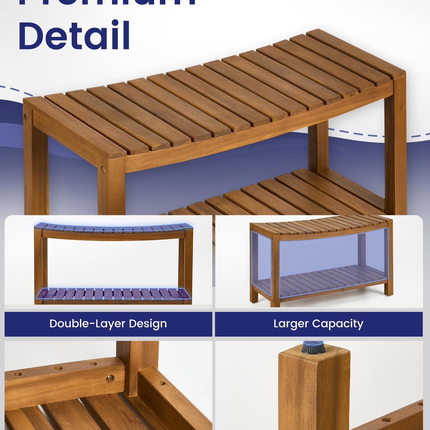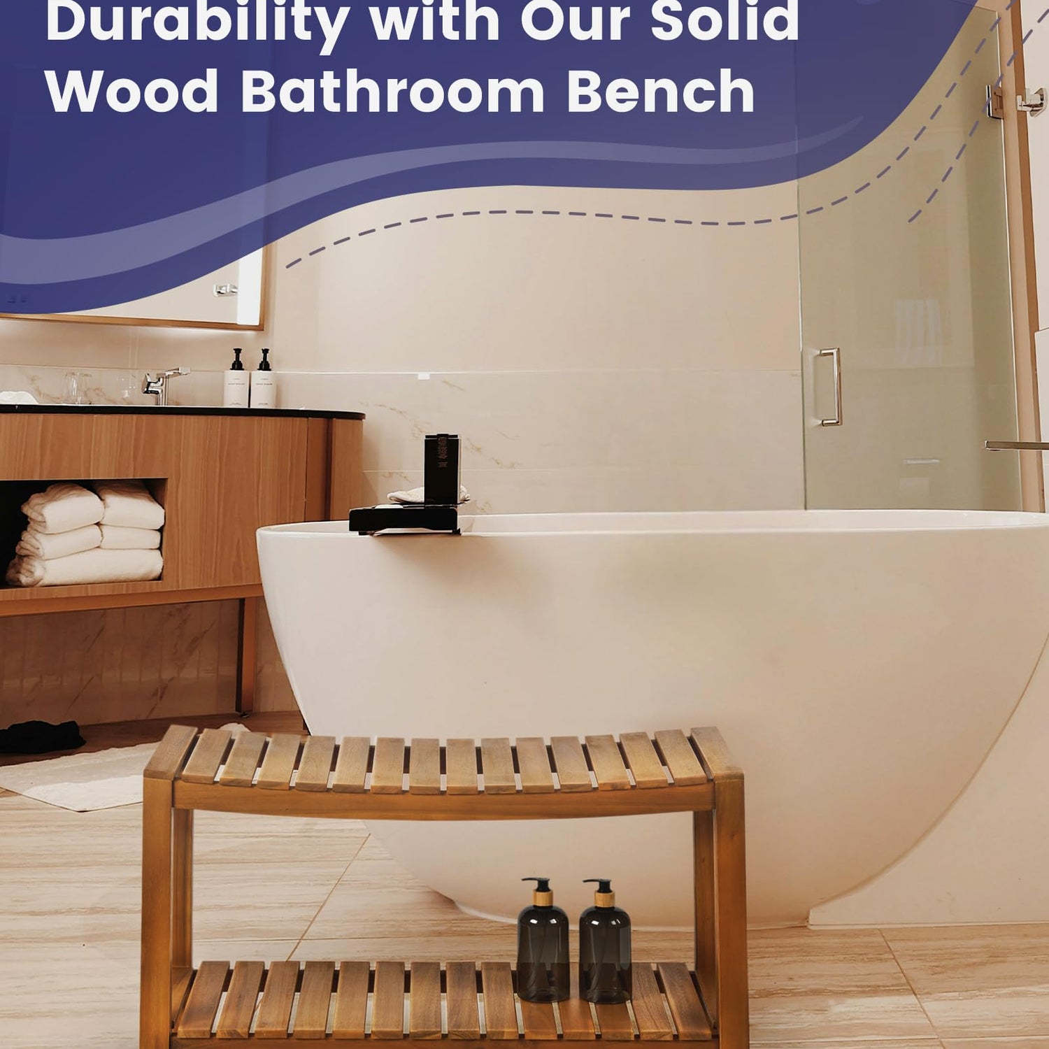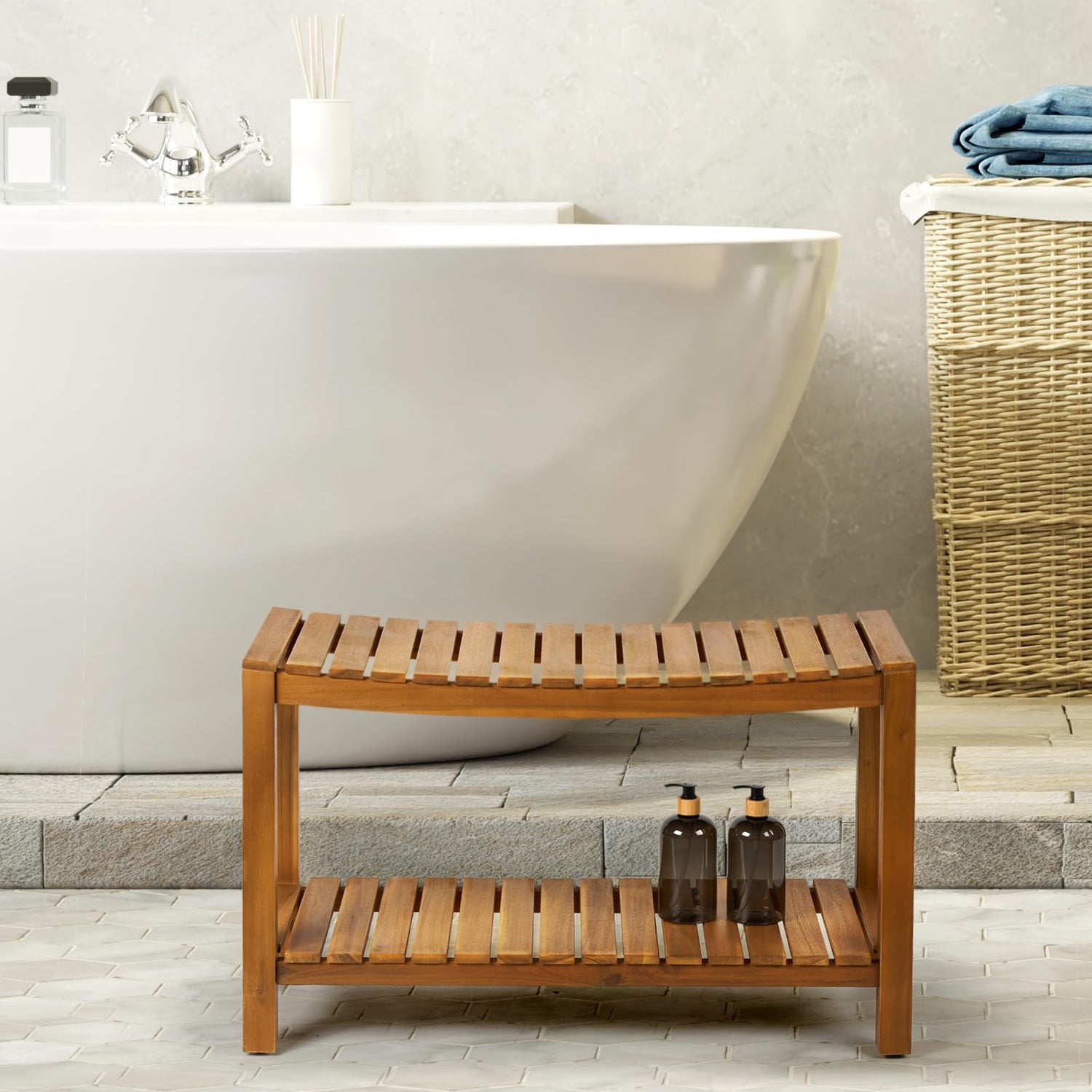 - CURVED SEAT DESIGN FOR COMFORTABLE SEATING - Experience the perfect blend of comfort and strength. The teak bench boasts a curved seat design, offering lasting seating comfort. With a solid construction weighing 14 lbs and the capacity to hold up to 500 lbs, enjoy a stable and comfortable seating solution in your shower, on your patio, or by the pool.