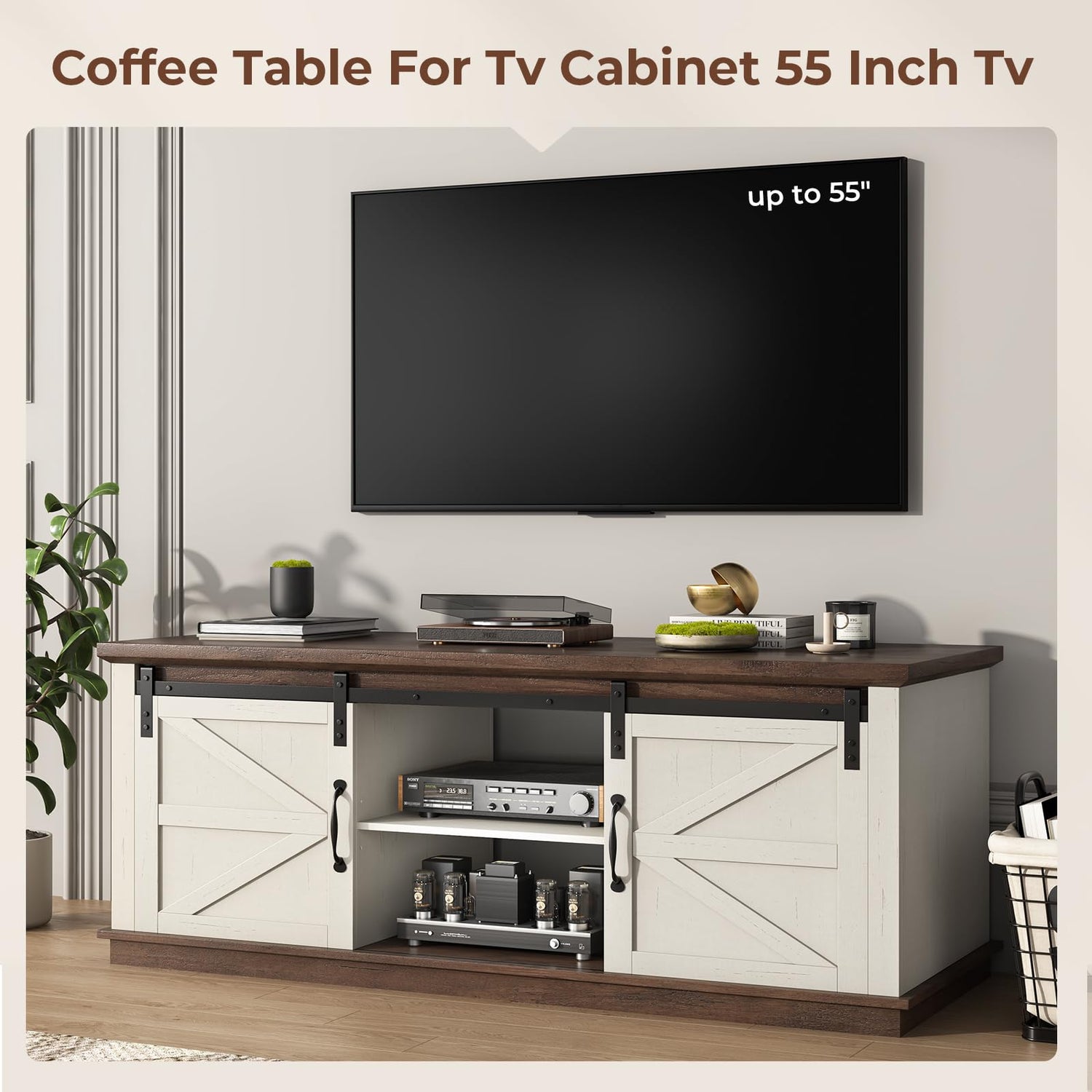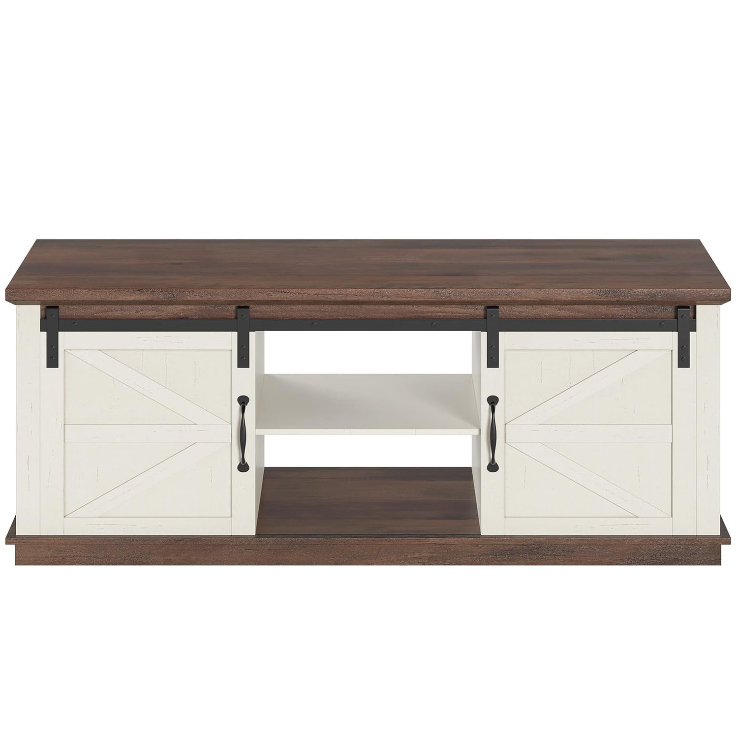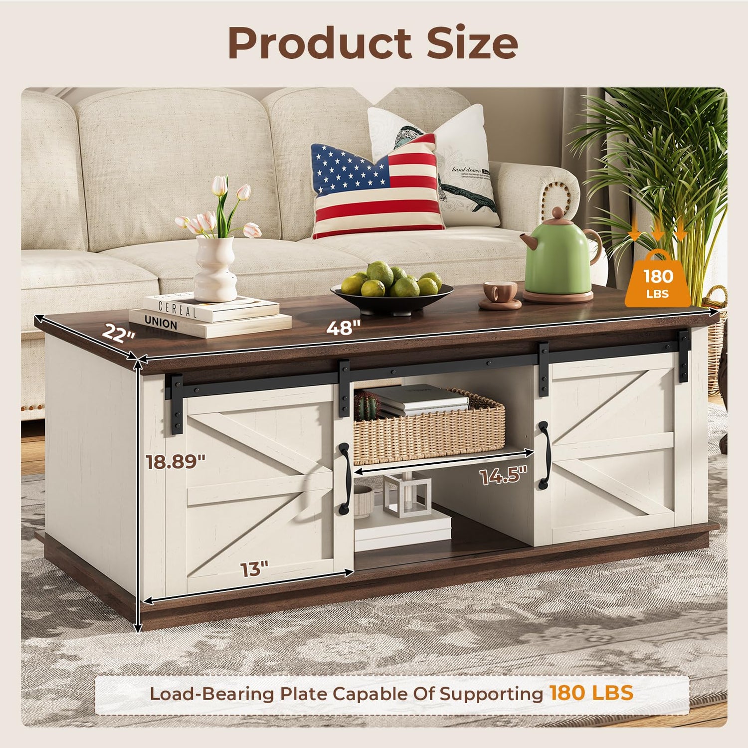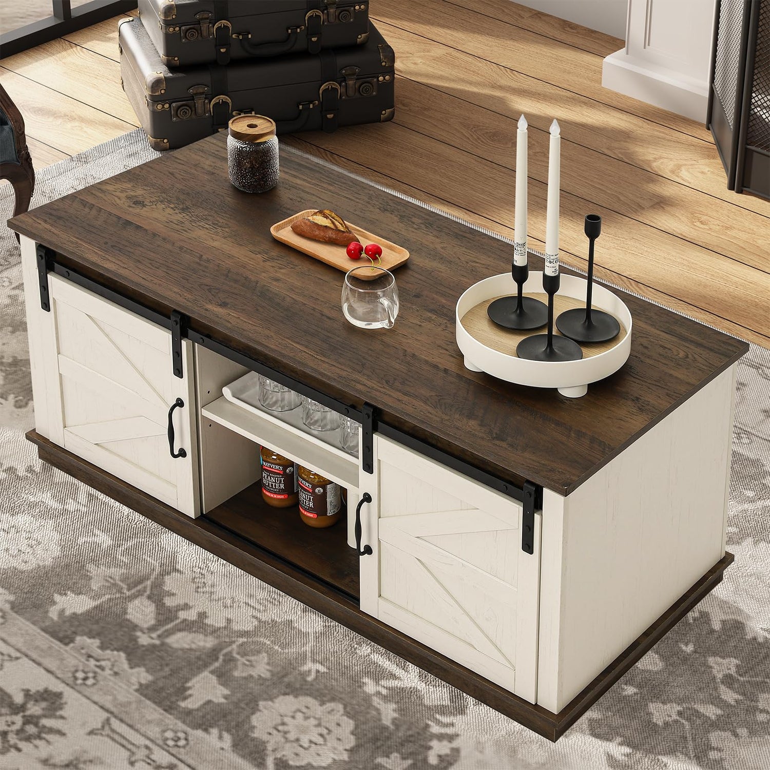 UPOSOJA Farmhouse Coffee Table for Living Room with Storage & 4 Sliding Barn Doors, Adjustable Shelves, Modern Rectangular Rustic Living Room, Meeting Room, Hall Coffee Tables (White Brown)