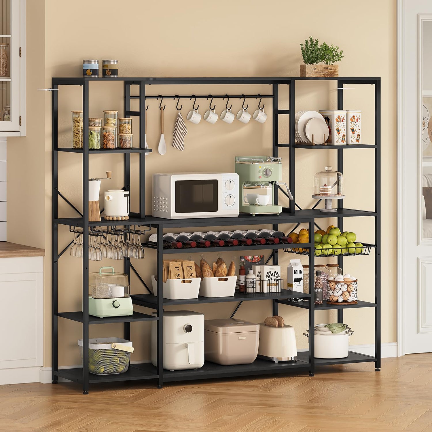 - 【Ample Storage Space】This microwave stand provides diverse storage space. Its integrated structure includes 8 hooks, 12 open storage racks, a wine rack, a stemware rack, a pull-out wire basket, suitable for home kitchens, living rooms, coffee bars and other scenes.