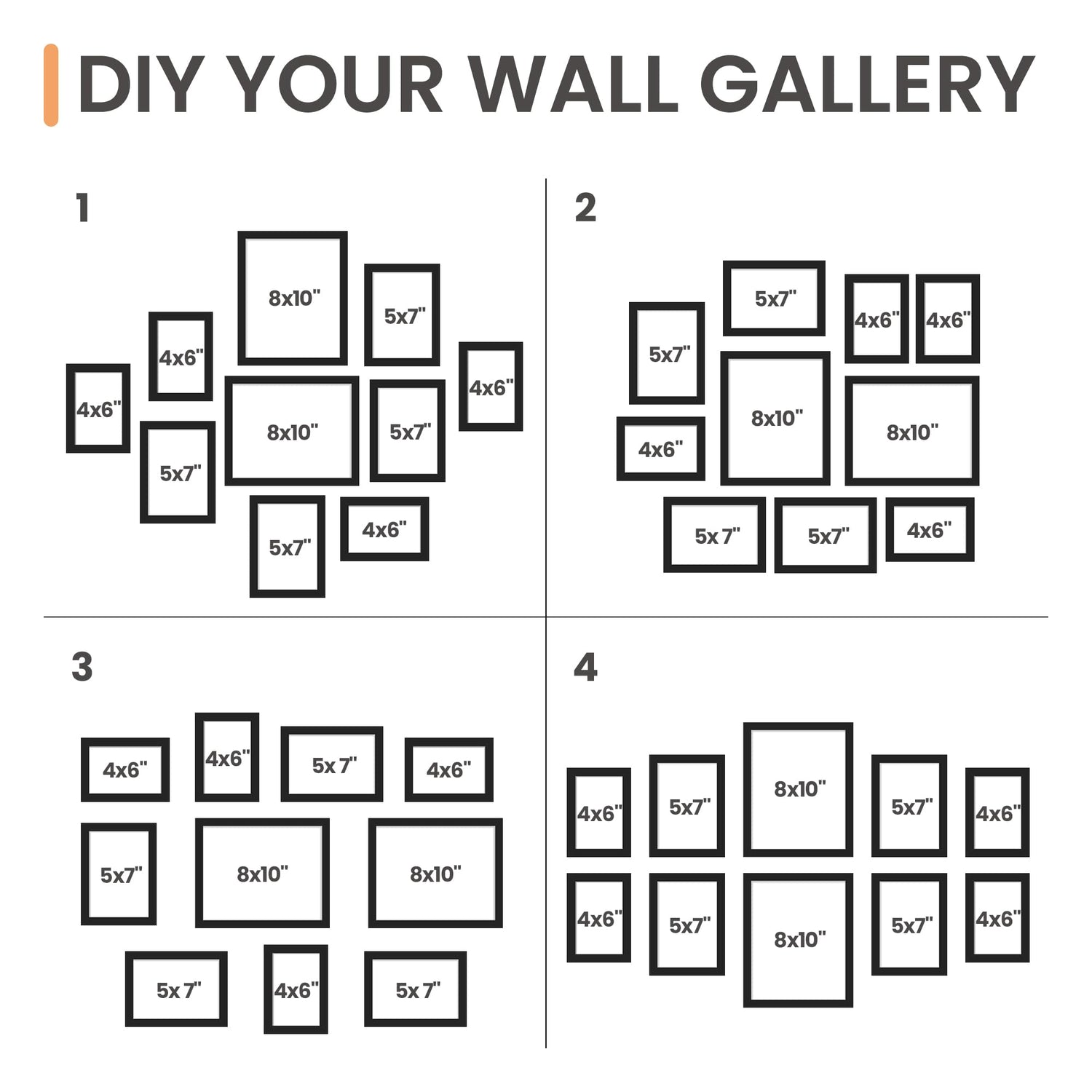 - 【Multi Sizes for DIY】10 Pack Picture Frames Set includes 2pcs 8x10 frames, 4pcs 5x7 frames and 4pcs 4x6 frames. You can decide how to arrange these different sizes frames. We also provide several layout in user manual for reference. One set meets your needs of wall gallery art at one time.