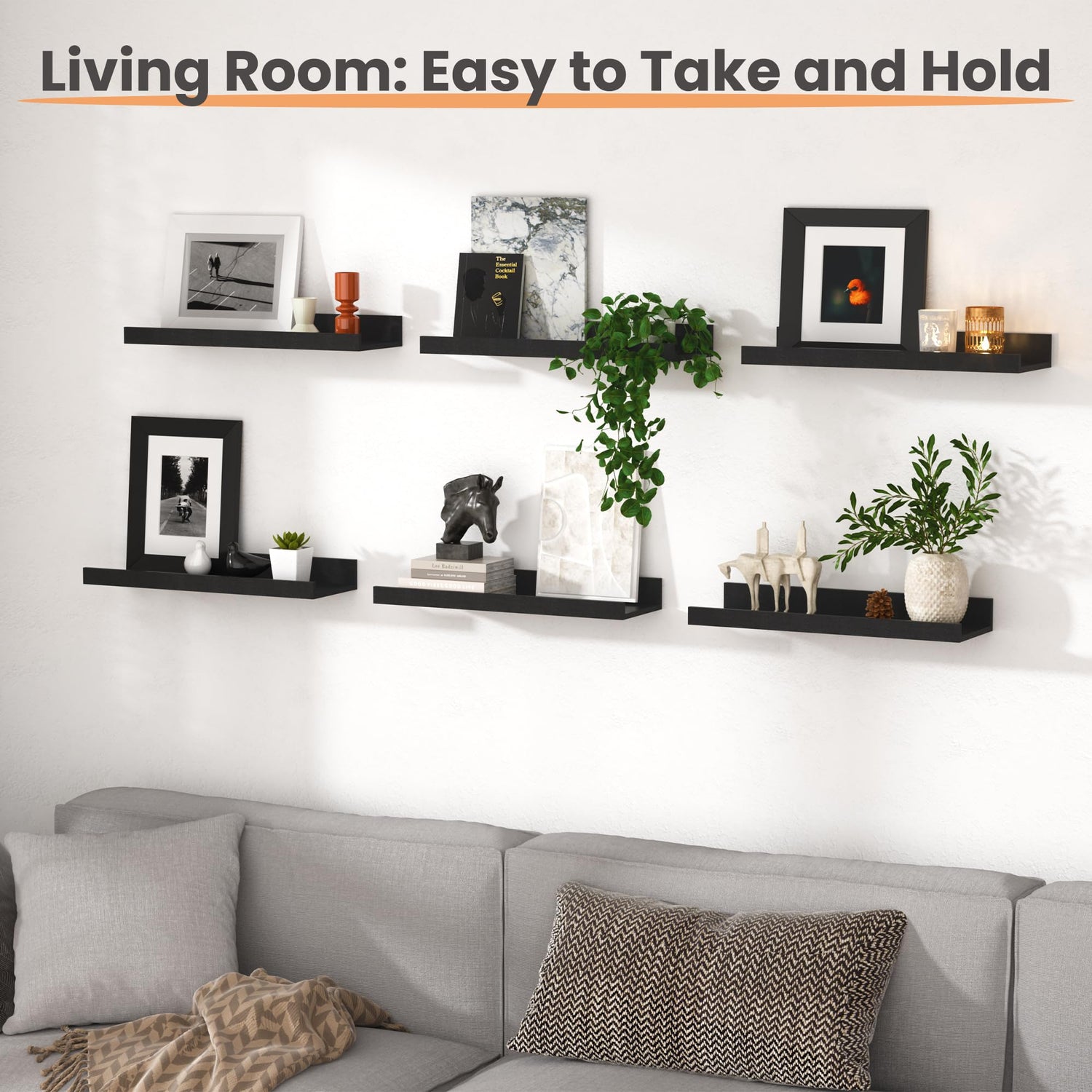 upsimples Floating Shelves for Wall, Wall Shelves for Decor Storage Set of 6, Wall Mounted Wood Shelves for Bedroom, Living Room, Bathroom, Kitchen, Picture Ledge Shelves, Black