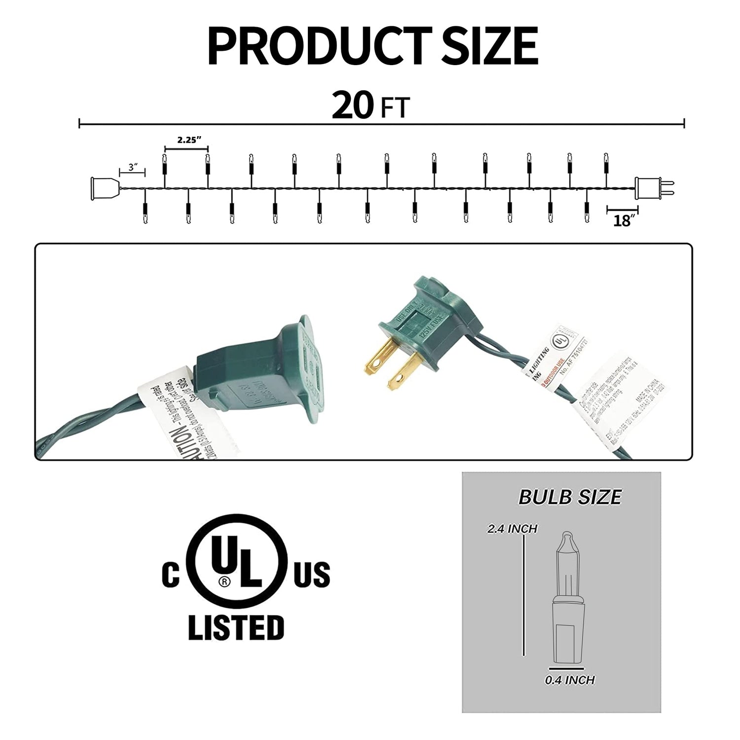 - 【PERFECT DEMENSION】 Our Christmas String lights's toatal length is 20 FT, each bulb spacing 2.25 inch, each bulb is 0.4 x 2.4 Inch(L x H).Place or hang the exquisite string lights on the trees, grass, bushes or any place you want, very easy to decorate.