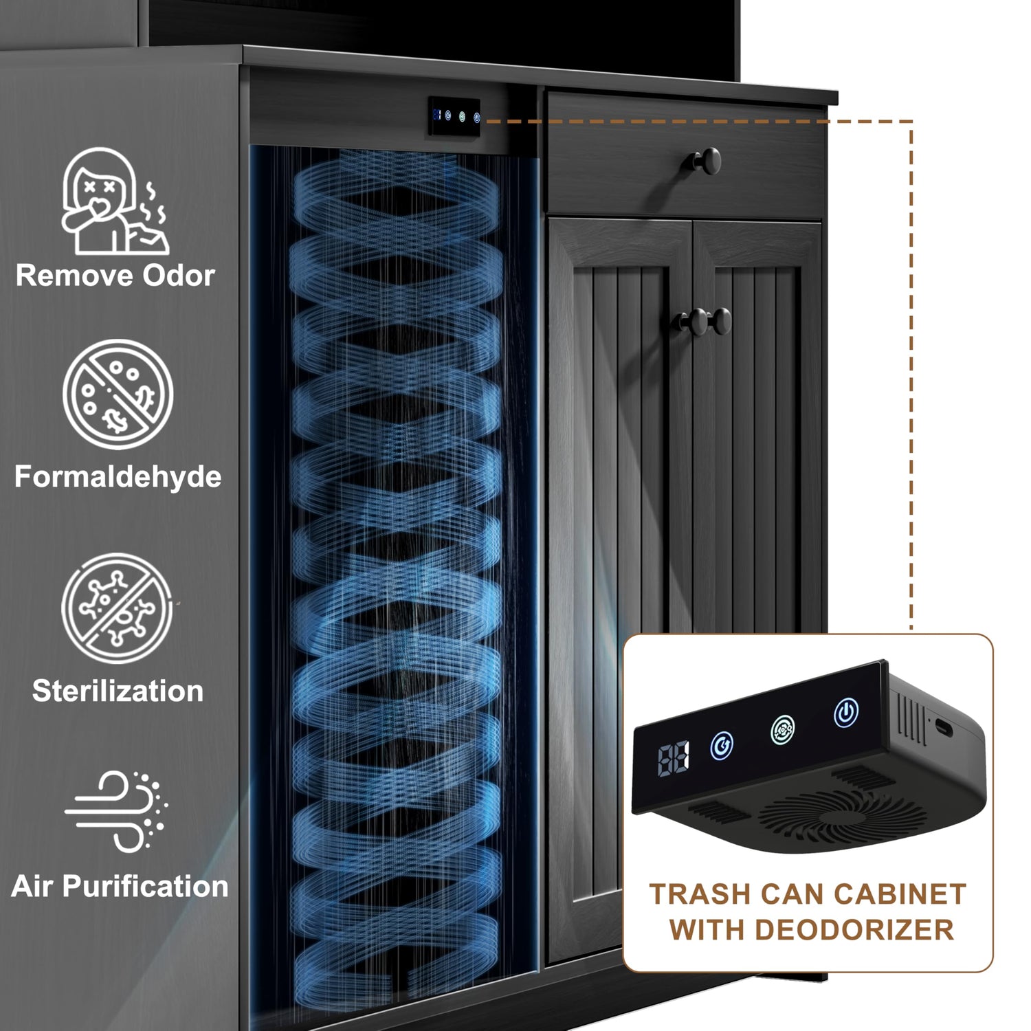 - [Pantry Tilt Out Cabinet with Deodoriser] This kitchen pantry cabinet features a hidden trash cabinet design that ensures unsightly rubbish is kept hidden. Not only does this innovative method give your kitchen a neat and organised look, it also prevents odours from escaping and ensures a fresh and clean cooking space.