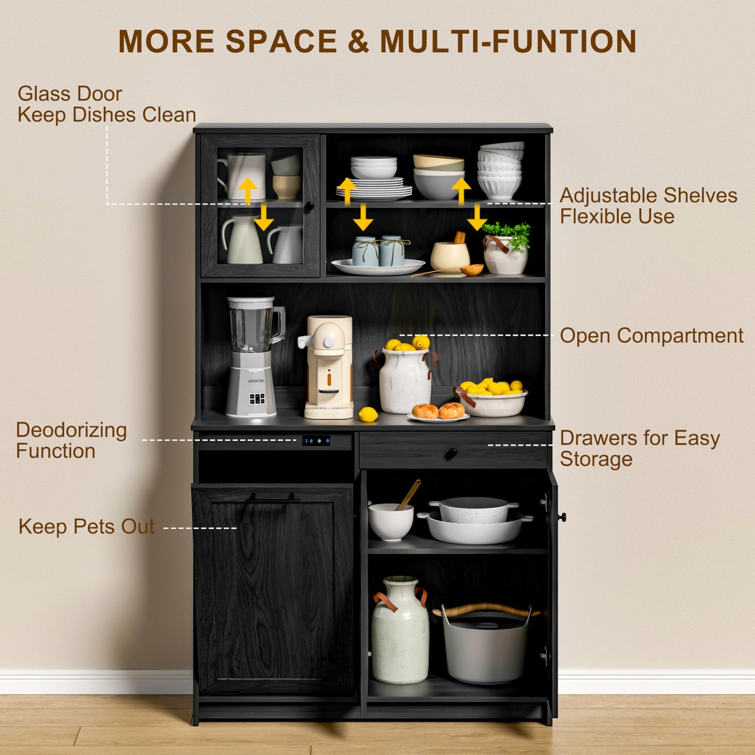 - [Sturdy and Practical] This freestanding kitchen hutch cabinet is made from high quality panels with thick panels and a sturdy and durable construction. The combination of these materials ensures long-lasting durability as well as solidity, while the multi-level storage shelves meet the storage needs of consumers.