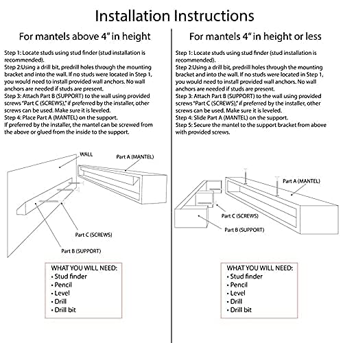- What you will get: Mantel, installation bracket, screws, and dry wall anchors. To make the installation process effortless and quick, a you will need: Tape measure, Stud finder, Pencil, Level, & Drill.