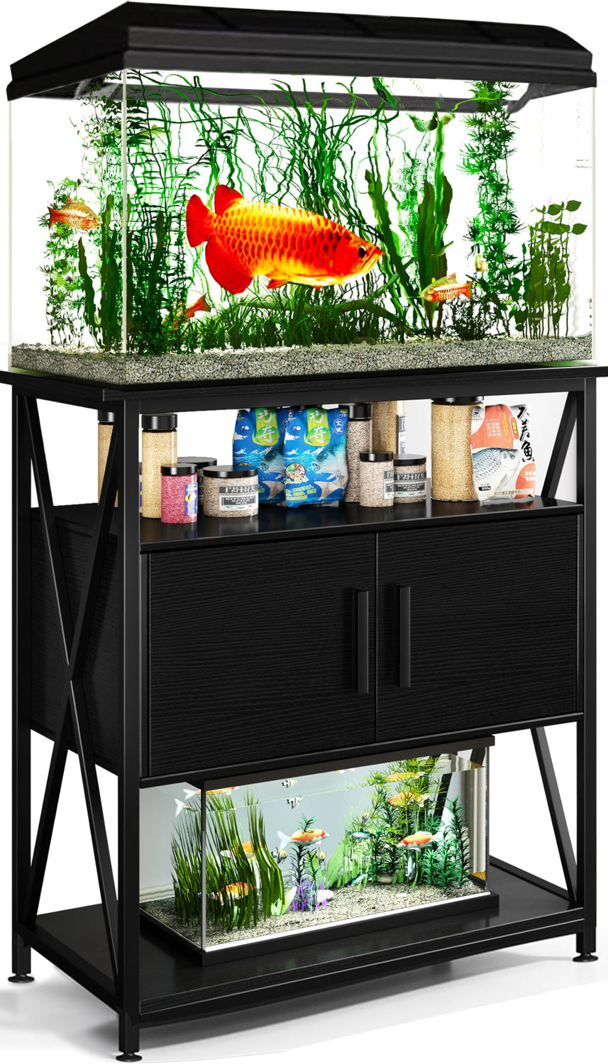 - This stand is crafted of spacious tabletop, one middle cabinet and 2-tier open storage shelf. Providing ample rooms for displaying and storing aquarium tools.The fish tank stand maximizes space to store various fish tank cleaning set tools, aquascaping tools, fish feed, fish net, algae scraper, sponge brush cleaner, fish tank algae remover, etc.