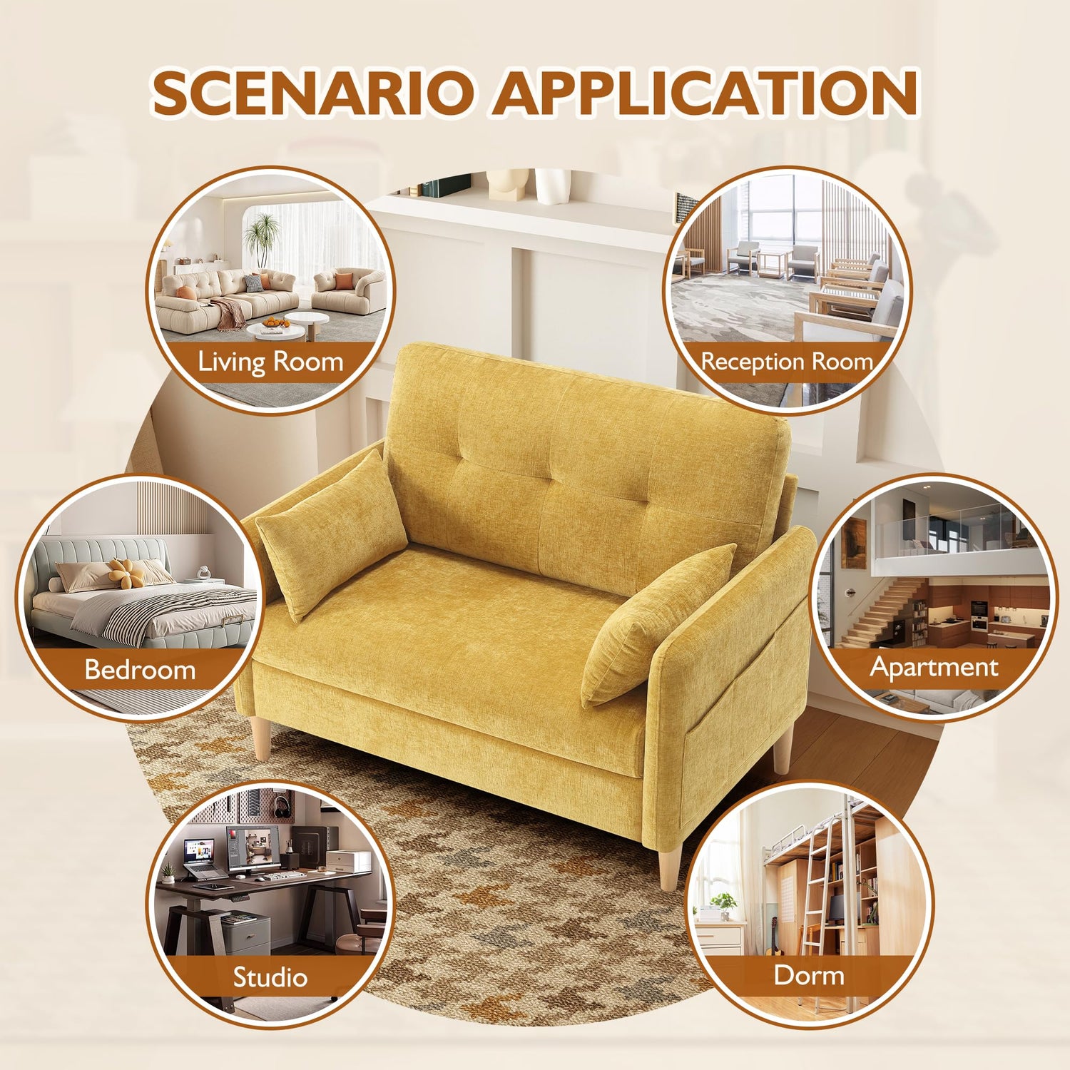 Urhanherry 47" Small Sofa Couch for Bedroom, Soft Chenille loveseat Mini Couch with Throw Pillow and Removable Cushion Cover for Small Spaces, Living Room, Apartment, Dorm, Office(Yellow)