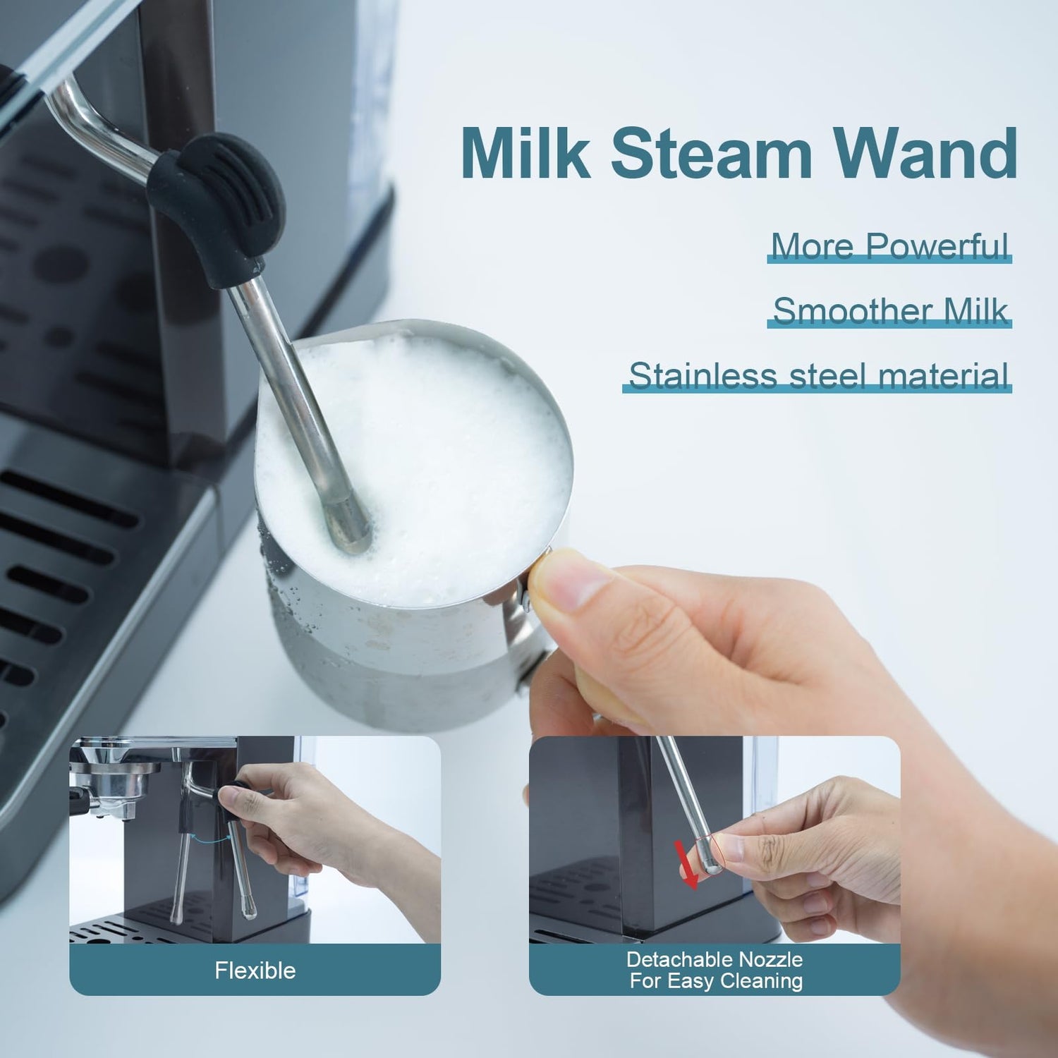 - Powerful Milk Frothing System: The espresso maker with milk frother has a powerful steam wand, so you can creat thick, silky microfoam milk to enhance the flavor of the coffee and enable the creation of latte art. This cappuccino coffee machine features a full stainless steel housing that is stylish and durable. Besides, the compact design of this espresso cappuccino maker with a modern aesthetic that fits a variety of kitchen or countertop space decors
