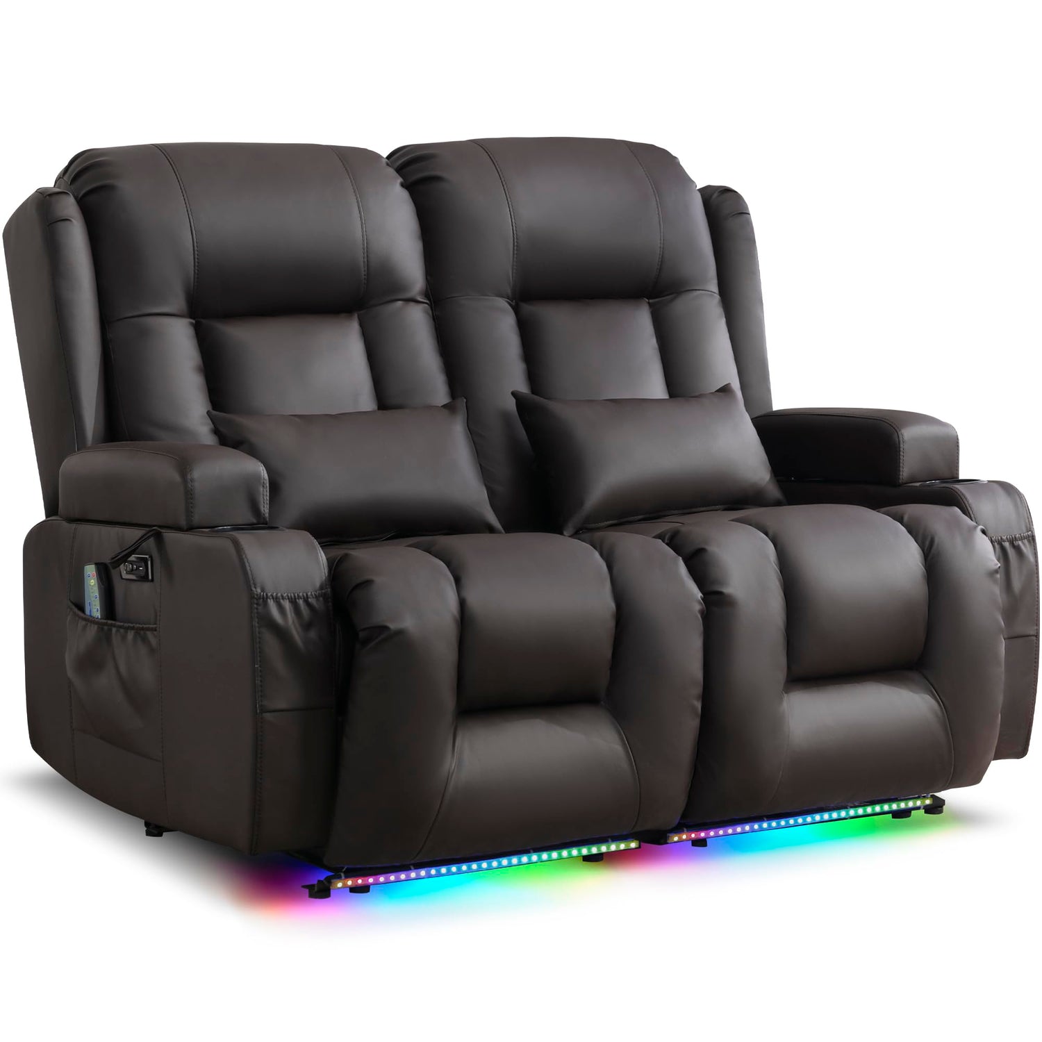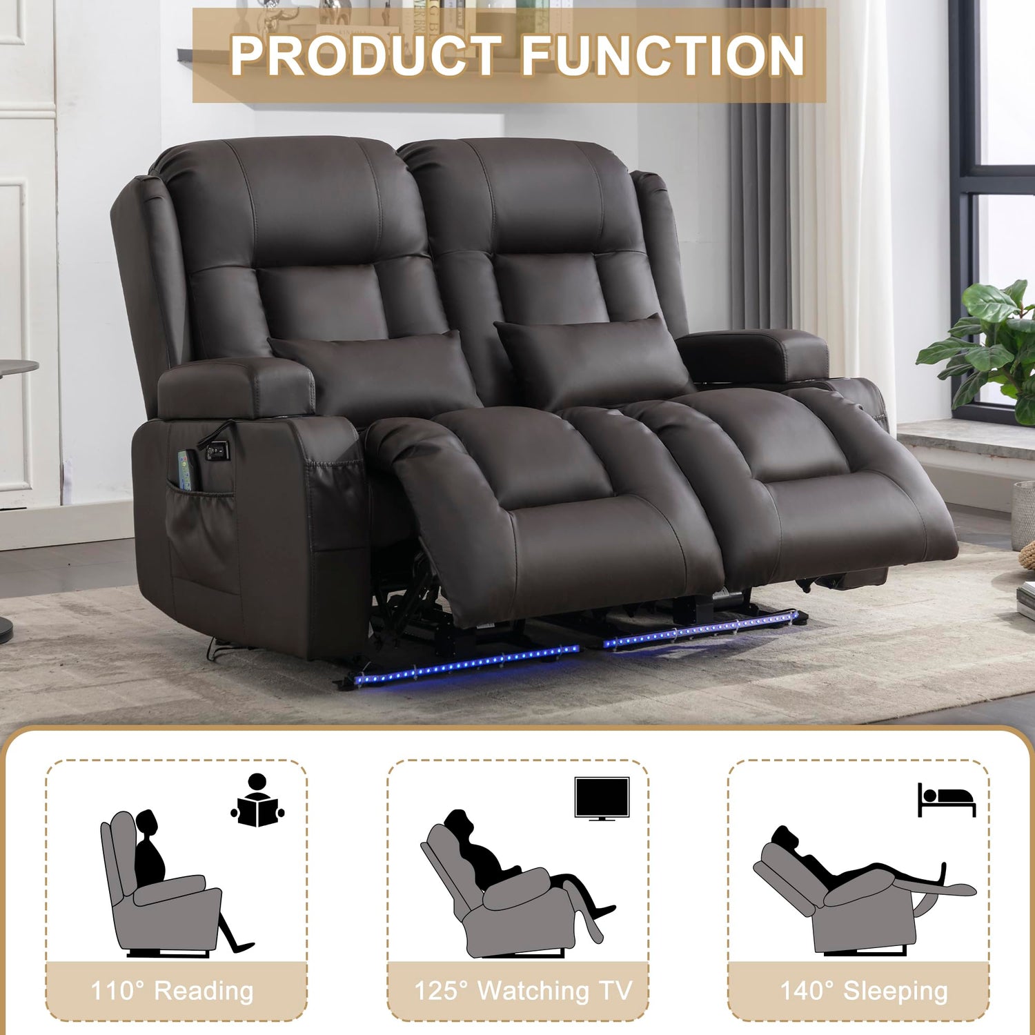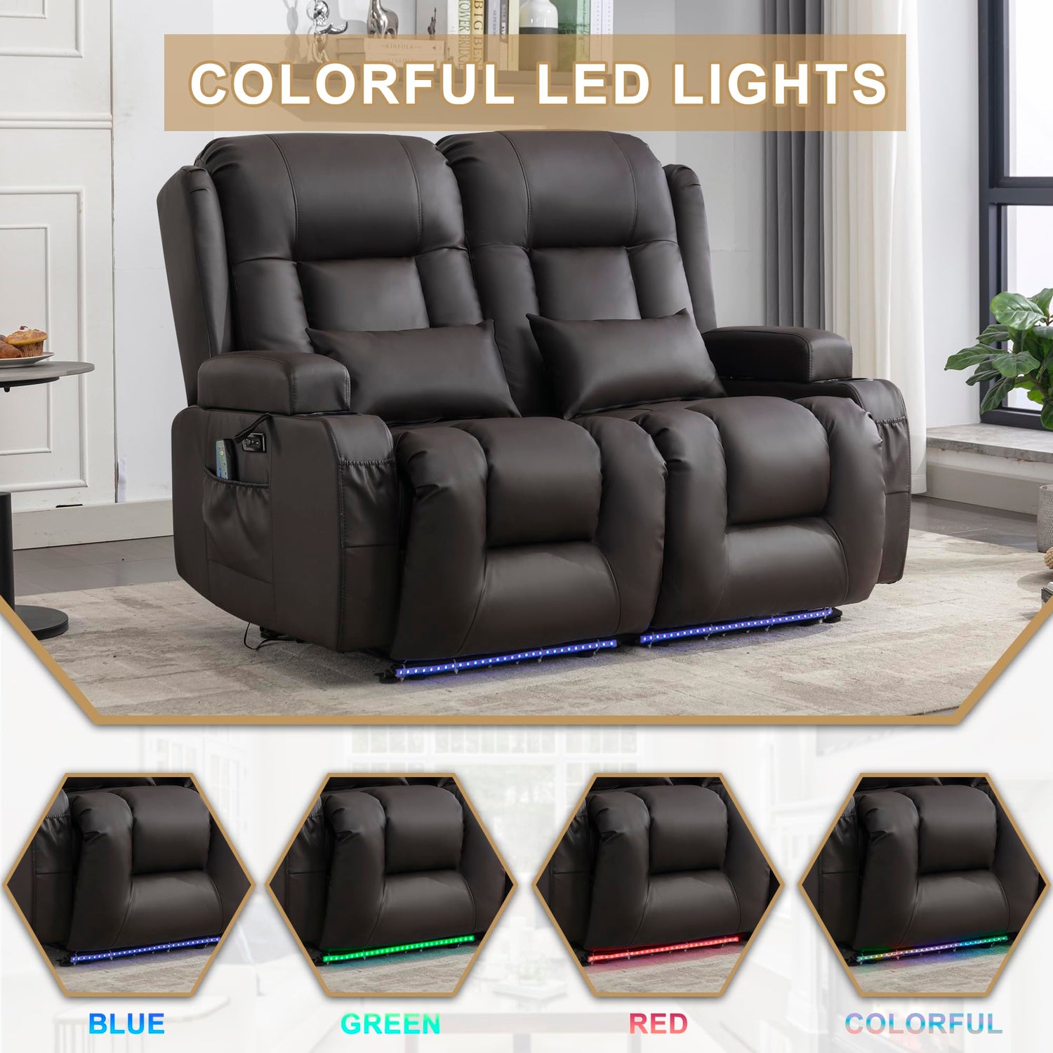 URRED Loveseat Recliner Sofa with Massage and Heat, Power Reclining Loveseat Sofa RV Couch Home Theater Seating with LED Lights, Cup Holders, Side Pockets, USB, Pillows, Faux Leather, Dark Brown