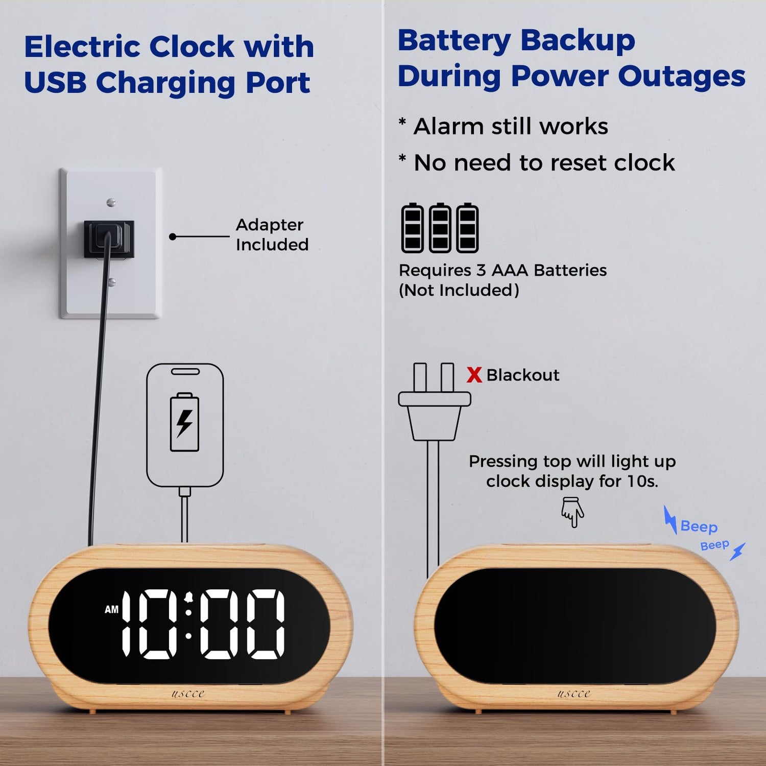uscce Small Digital Clock for Bedroom: 6 Dimmable Brightness 4 Alarm Volume - Plug in Clock with Easy Operation for Bedside Desk Wood Grain