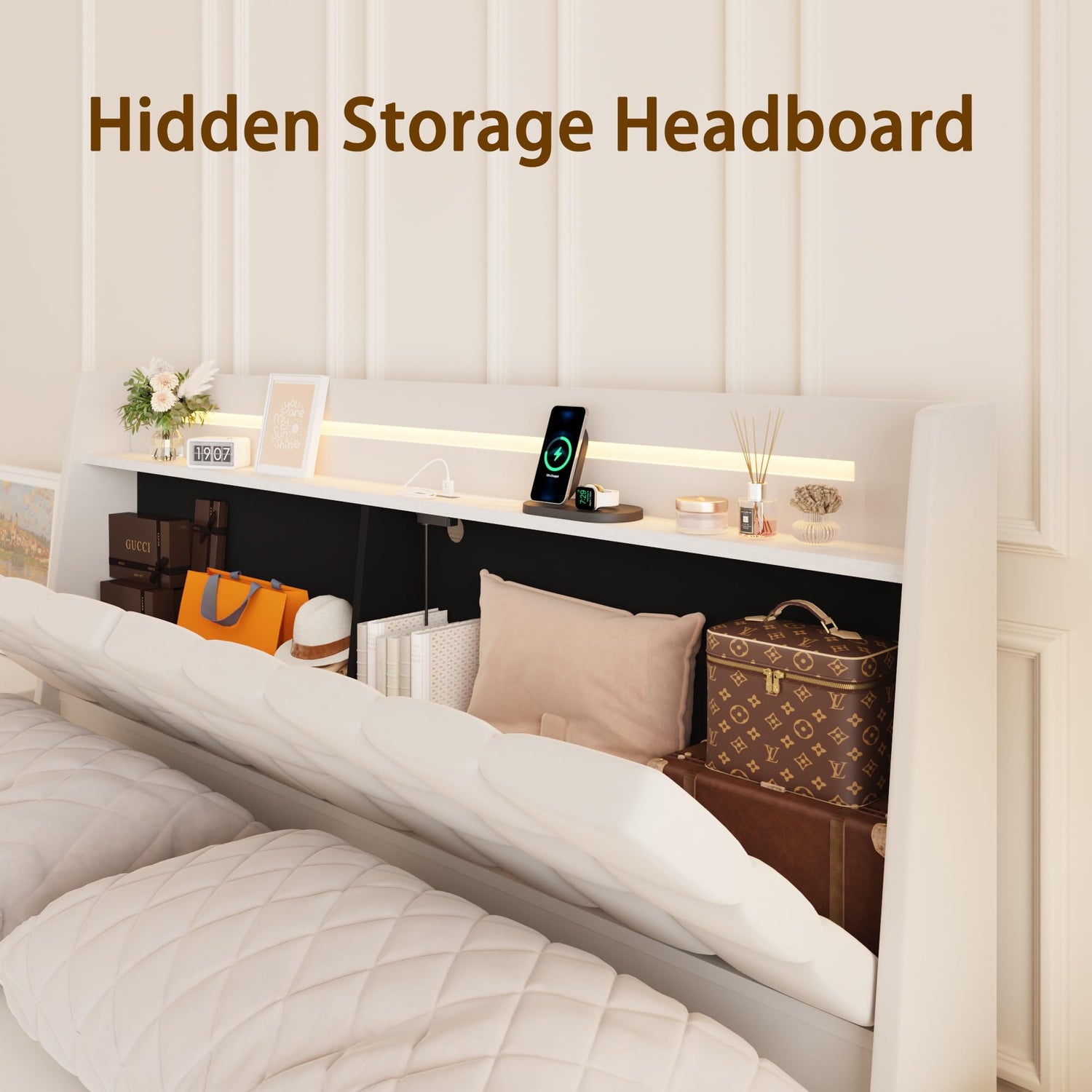 The ingenious storage headboard features ample room with a shelf and two hidden compartments, perfect for neatly organising essentials such as phones, eyeglasses, and decorative items. Stay effortlessly connected with two built-in USB ports, ensuring your devices are always charged and within easy reach.